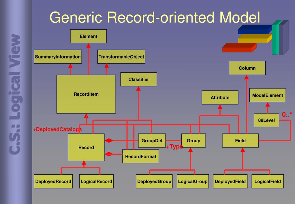 Generic Record-oriented Model Element SummaryInformation TransformableObject Column Classifier RecordItem C.S.: Logical View ModelElement Attribute 0..* 88Level +DeployedCatalogs Record GroupDef Group Field +Type RecordFormat DeployedRecord LogicalRecord DeployedGroup LogicalGroup DeployedField LogicalField