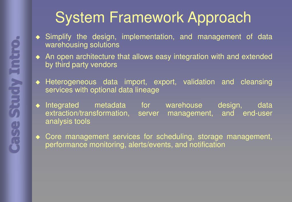 System Framework Approach • Simplify the design, implementation, and management of data warehousing solutions • An open architecture that allows easy integration with and extended by third party vendors • Heterogeneous data import, export, validation and cleansing services with optional data lineage • Integrated metadata for warehouse design, data extraction/transformation, server management, and end-user analysis tools • Core management services for scheduling, storage management, performance monitoring, alerts/events, and notification Case Study Intro.