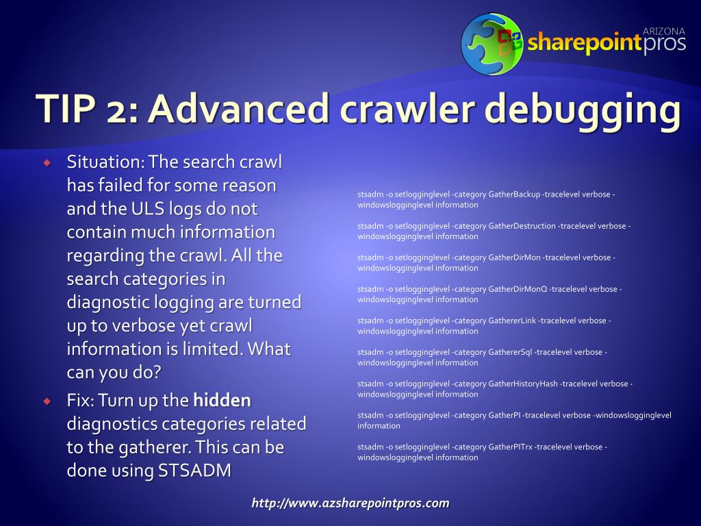 TIP 2: Advanced crawler debugging stsadm -o setlogginglevel -category GatherBackup -tracelevel verbose -windowslogginglevel information stsadm -o setlogginglevel -category GatherDestruction -tracelevel verbose -windowslogginglevel information stsadm -o setlogginglevel -category GatherDirMon -tracelevel verbose -windowslogginglevel information stsadm -o setlogginglevel -category GatherDirMonQ -tracelevel verbose -windowslogginglevel information stsadm -o setlogginglevel -category GathererLink -tracelevel verbose -windowslogginglevel information stsadm -o setlogginglevel -category GathererSql -tracelevel verbose -windowslogginglevel information stsadm -o setlogginglevel -category GatherHistoryHash -tracelevel verbose -windowslogginglevel information stsadm -o setlogginglevel -category GatherPI -tracelevel verbose -windowslogginglevel information stsadm -o setlogginglevel -category GatherPITrx -tracelevel verbose -windowslogginglevel information Situation: The search crawl has failed for some reason and the ULS logs do not contain much information regarding the crawl. All the search categories in diagnostic logging are turned up to verbose yet crawl information is limited. What can you do? Fix: Turn up the hidden diagnostics categories related to the gatherer. This can be done using STSADM