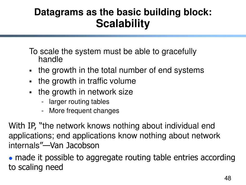 Datagrams as the basic building block: Scalability To scale the system must be able to gracefully handle • the growth in the total number of end systems • the growth in traffic volume • the growth in network size • larger routing tables • More frequent changes With IP, “the network knows nothing about individual end applications; end applications know nothing about network internals”—Van Jacobson • made it possible to aggregate routing table entries according to scaling need