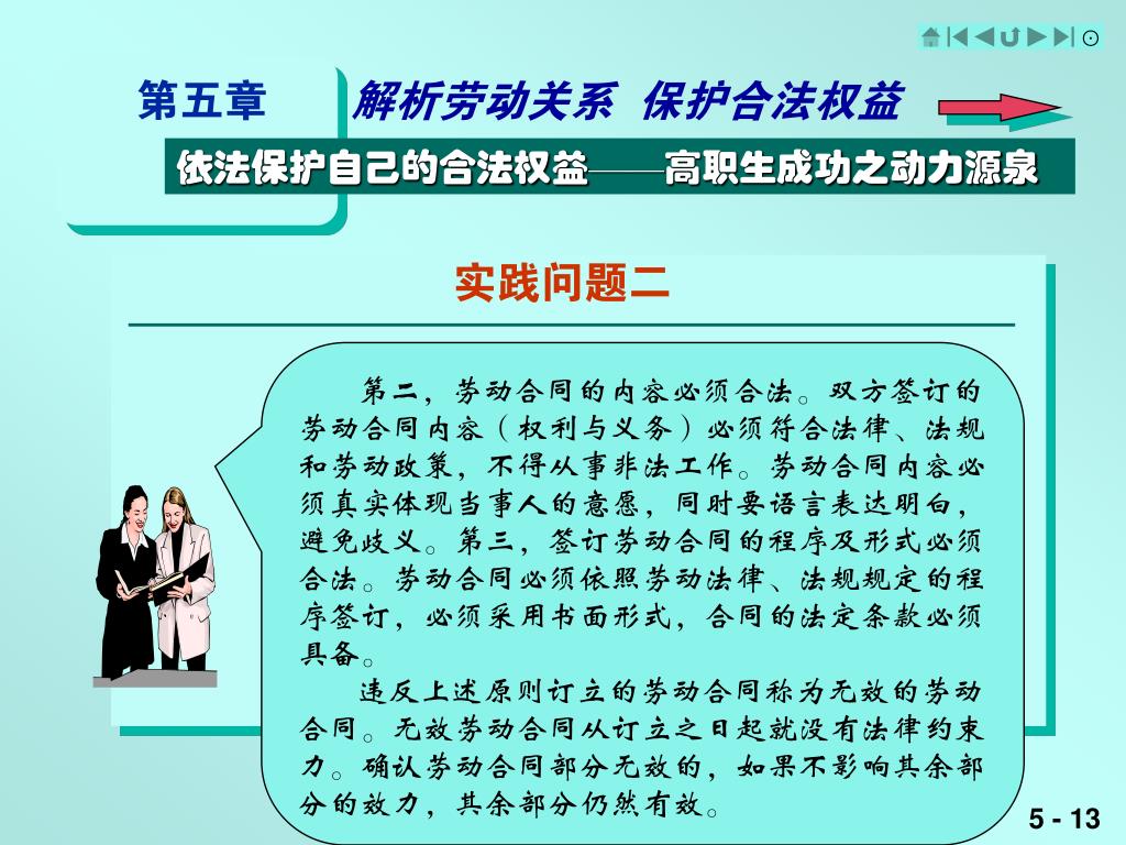 第五章 解析劳动关系 保护合法权益 依法保护自己的合法权益——高职生成功之动力源泉 实践问题二 第二,劳动合同的内容必须合法。双方签订的劳动合同内容(权利与义务)必须符合法律、法规和劳动政策,不得从事非法工作。劳动合同内容必须真实体现当事人的意愿,同时要语言表达明白,避免歧义。第三,签订劳动合同的程序及形式必须合法。劳动合同必须依照劳动法律、法规规定的程序签订,必须采用书面形式,合同的法定条款必须具备。 违反上述原则订立的劳动合同称为无效的劳动合同。无效劳动合同从订立之日起就没有法律约束力。确认劳动合同部分无效的,如果不影响其余部分的效力,其余部分仍然有效。