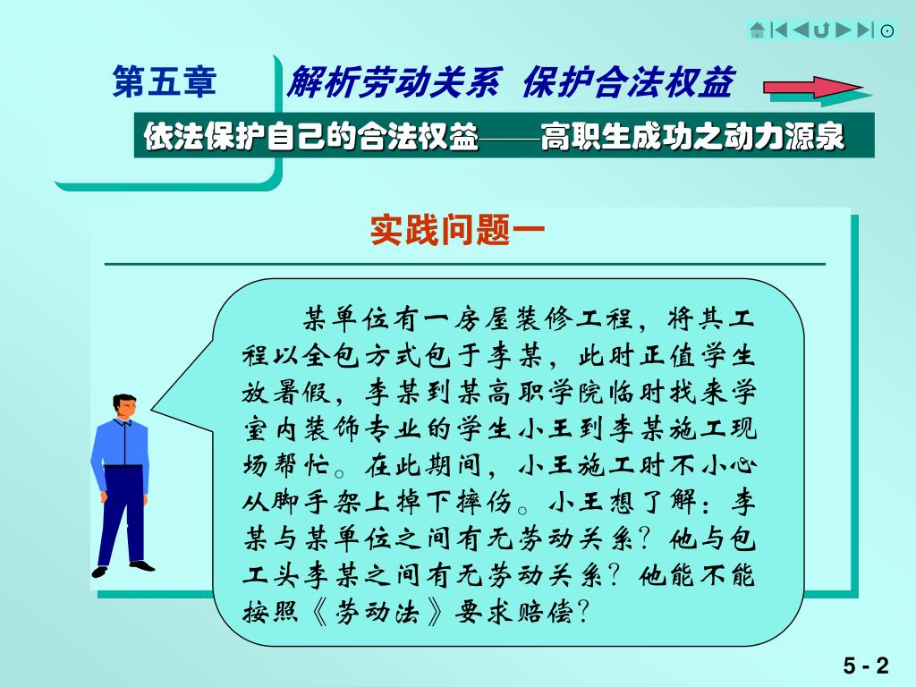 第 六 章 解析劳动关系 保护合法权益. 第五章. 解析劳动关系 保护合法权益. 依法保护自己的合法权益 —— 高职生成功之动力源泉. 实践问题一. 某单位有一房屋装修工程,将其工程以全包方式包于李某,此时正值学生放暑假,李某到某高职学院临时找来学室内装饰专业的学生小王到李某施工现场帮忙。在此期间,小王施工时不小心从脚手架上掉下摔伤。小王想了解:李某与某单位之间有无劳动关系?他与包工头李某之间有无劳动关系?他能不能按照 《 劳动法 》 要求赔偿?. 第五章. 解析劳动关系 保护合法权益. 依法保护自己的合法权益 —— 高职生成功之动力源泉. 实践问题一.