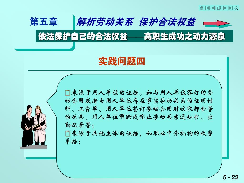 第五章 解析劳动关系 保护合法权益 依法保护自己的合法权益——高职生成功之动力源泉 实践问题四 来源于用人单位的证据。如与用人单位签订的劳动合同或者与用人单位存在事实劳动关系的证明材料、工资单、用人单位签订劳动合同时收取押金等的收条、用人单位解除或终止劳动关系通知书、出勤记录等; 来源于其他主体的证据,如职业中介机构的收费单据;