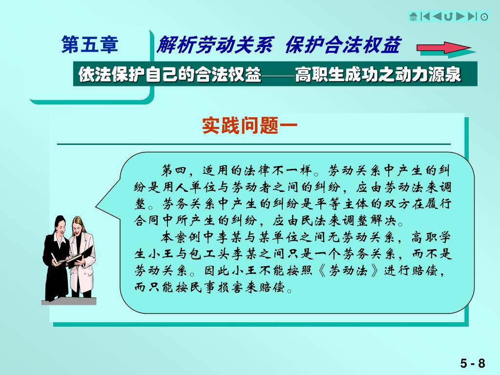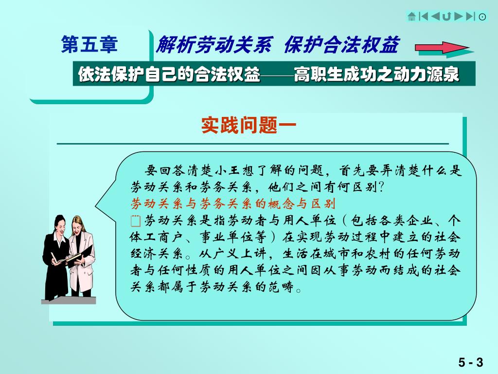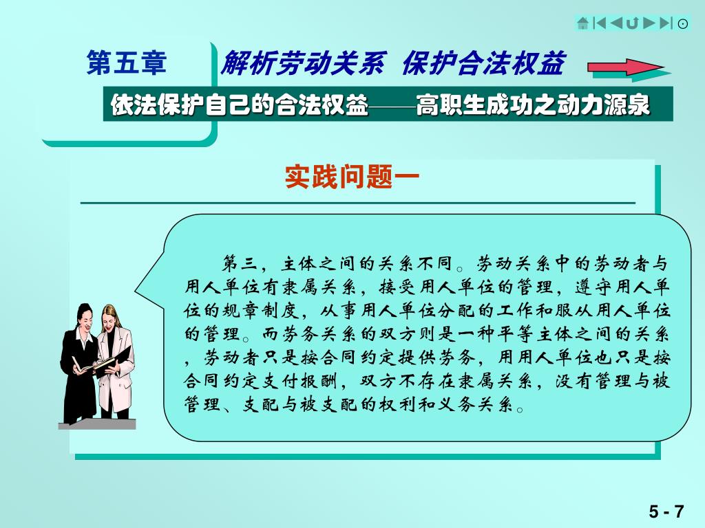 第五章 解析劳动关系 保护合法权益 依法保护自己的合法权益——高职生成功之动力源泉 实践问题一 第三,主体之间的关系不同。劳动关系中的劳动者与用人单位有隶属关系,接受用人单位的管理,遵守用人单位的规章制度,从事用人单位分配的工作和服从用人单位的管理。而劳务关系的双方则是一种平等主体之间的关系,劳动者只是按合同约定提供劳务,用用人单位也只是按合同约定支付报酬,双方不存在隶属关系,没有管理与被管理、支配与被支配的权利和义务关系。