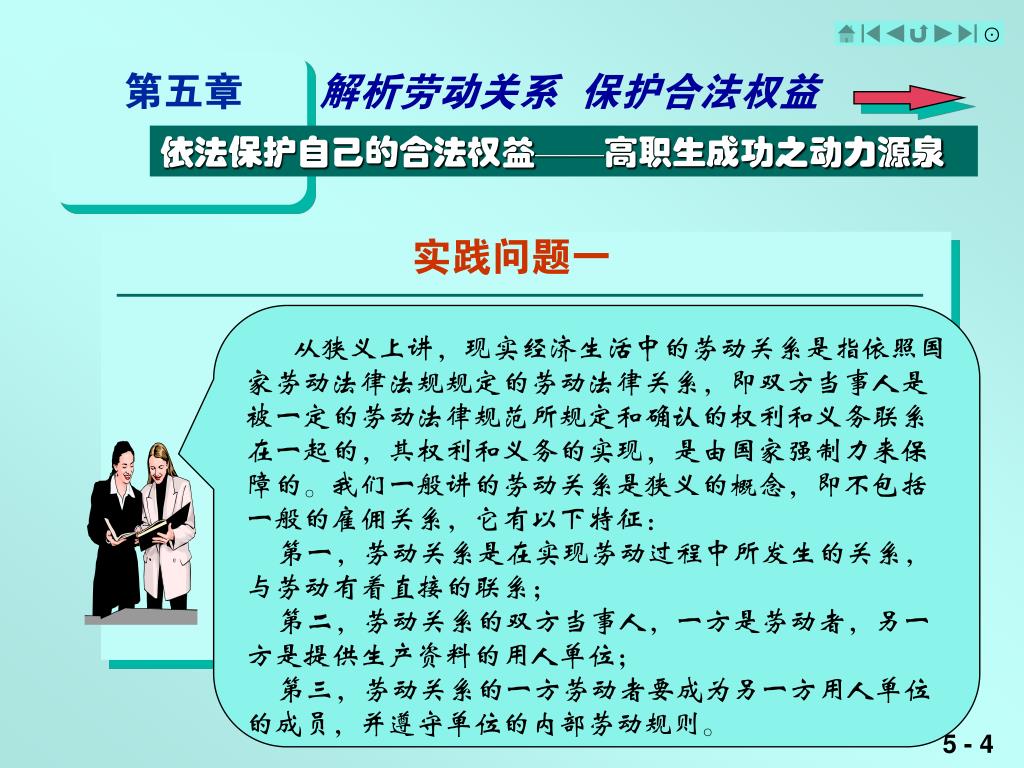 第五章 解析劳动关系 保护合法权益 依法保护自己的合法权益——高职生成功之动力源泉 实践问题一 从狭义上讲,现实经济生活中的劳动关系是指依照国家劳动法律法规规定的劳动法律关系,即双方当事人是被一定的劳动法律规范所规定和确认的权利和义务联系在一起的,其权利和义务的实现,是由国家强制力来保障的。我们一般讲的劳动关系是狭义的概念,即不包括一般的雇佣关系,它有以下特征: 第一,劳动关系是在实现劳动过程中所发生的关系,与劳动有着直接的联系; 第二,劳动关系的双方当事人,一方是劳动者,另一方是提供生产资料的用人单位; 第三,劳动关系的一方劳动者要成为另一方用人单位的成员,并遵守单位的内部劳动规则。