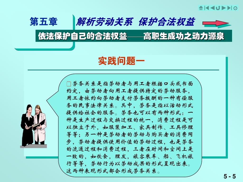 第五章 解析劳动关系 保护合法权益 依法保护自己的合法权益——高职生成功之动力源泉 实践问题一 劳务关系是指劳动者与用工者根据口头或书面约定,由劳动者向用工者提供特定的劳动服务,用工者依约向劳动者支付劳务报酬的一种有偿服务的民事法律关系。其中,劳务是指以活动形式提供给社会的服务。劳务也可以有两种形式:一种是生产过程与交换过程的统一,消费过程是可以独立于外,如服装加工、家具制作、工具修理等等;另一种是劳动者的劳动与购买者的消费同步,劳动者提供使用价值的劳动过程,也是劳务的流通过程和消费过程,三者在时间和空间上是一致的,如饮食,理发,旅客乘车、船、飞机旅行等等,劳动行为以劳动成果的形式呈现出来。这两种表现形式都会形成劳务关系。
