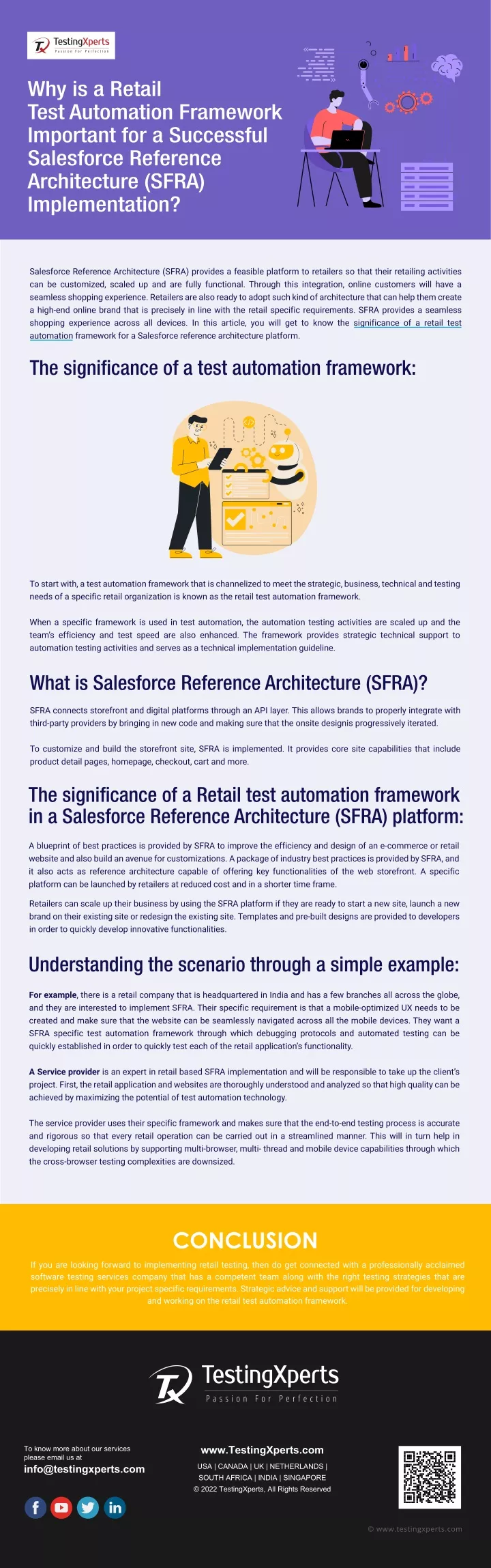 Why is a Retail Test Automation Framework Important for a Successful Salesforce Reference Architecture (SFRA) Implementation? Salesforce Reference Architecture (SFRA) provides a feasible platform to retailers so that their retailing activities can be customized, scaled up and are fully functional. Through this integration, online customers will have a seamless shopping experience. Retailers are also ready to adopt such kind of architecture that can help them create a high-end online brand that is precisely in line with the retail specific requirements. SFRA provides a seamless shopping experience across all devices. In this article, you will get to know the significance of a retail test automation framework for a Salesforce reference architecture platform. The significance of a test automation framework: To start with, a test automation framework that is channelized to meet the strategic, business, technical and testing needs of a specific retail organization is known as the retail test automation framework. When a specific framework is used in test automation, the automation testing activities are scaled up and the team’s efficiency and test speed are also enhanced. The framework provides strategic technical support to automation testing activities and serves as a technical implementation guideline. What is Salesforce Reference Architecture (SFRA)? SFRA connects storefront and digital platforms through an API layer. This allows brands to properly integrate with third-party providers by bringing in new code and making sure that the onsite designis progressively iterated. To customize and build the storefront site, SFRA is implemented. It provides core site capabilities that include product detail pages, homepage, checkout, cart and more. The significance of a Retail test automation framework in a Salesforce Reference Architecture (SFRA) platform: A blueprint of best practices is provided by SFRA to improve the efficiency and design of an e-commerce or retail website and also build an avenue for customizations. A package of industry best practices is provided by SFRA, and it also acts as reference architecture capable of offering key functionalities of the web storefront. A specific platform can be launched by retailers at reduced cost and in a shorter time frame. Retailers can scale up their business by using the SFRA platform if they are ready to start a new site, launch a new brand on their existing site or redesign the existing site. Templates and pre-built designs are provided to developers in order to quickly develop innovative functionalities. Understanding the scenario through a simple example: For example, there is a retail company that is headquartered in India and has a few branches all across the globe, and they are interested to implement SFRA. Their specific requirement is that a mobile-optimized UX needs to be created and make sure that the website can be seamlessly navigated across all the mobile devices. They want a SFRA specific test automation framework through which debugging protocols and automated testing can be quickly established in order to quickly test each of the retail application’s functionality. A Service provider is an expert in retail based SFRA implementation and will be responsible to take up the client’s project. First, the retail application and websites are thoroughly understood and analyzed so that high quality can be achieved by maximizing the potential of test automation technology. The service provider uses their specific framework and makes sure that the end-to-end testing process is accurate and rigorous so that every retail operation can be carried out in a streamlined manner. This will in turn help in developing retail solutions by supporting multi-browser, multi- thread and mobile device capabilities through which the cross-browser testing complexities are downsized. CONCLUSION If you are looking forward to implementing retail testing, then do get connected with a professionally acclaimed software testing services company that has a competent team along with the right testing strategies that are precisely in line with your project specific requirements. Strategic advice and support will be provided for developing and working on the retail test automation framework. www.TestingXperts.com To know more about our services please email us at info@testingxperts.com USA | CANADA | UK | NETHERLANDS | SOUTH AFRICA | INDIA | SINGAPORE © 2022 TestingXperts, All Rights Reserved © www.testingxperts.com