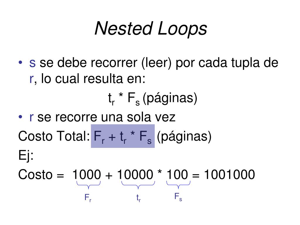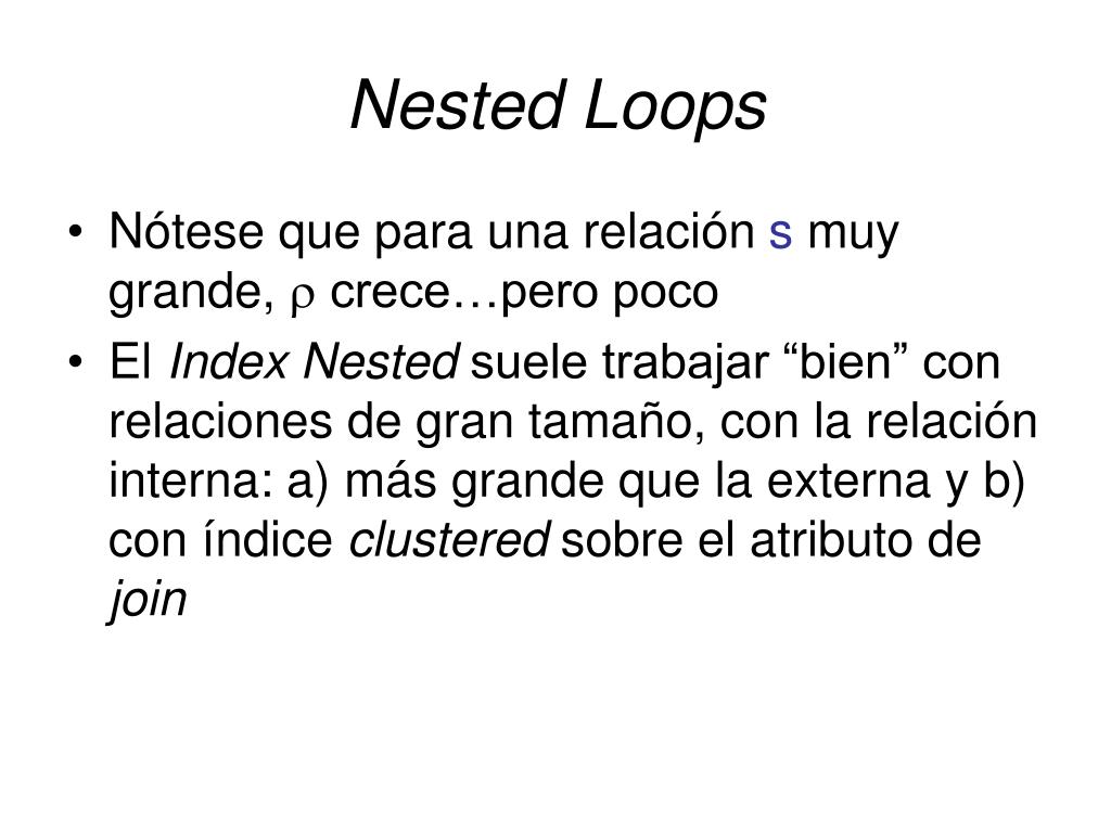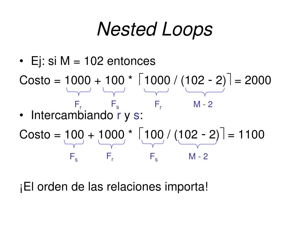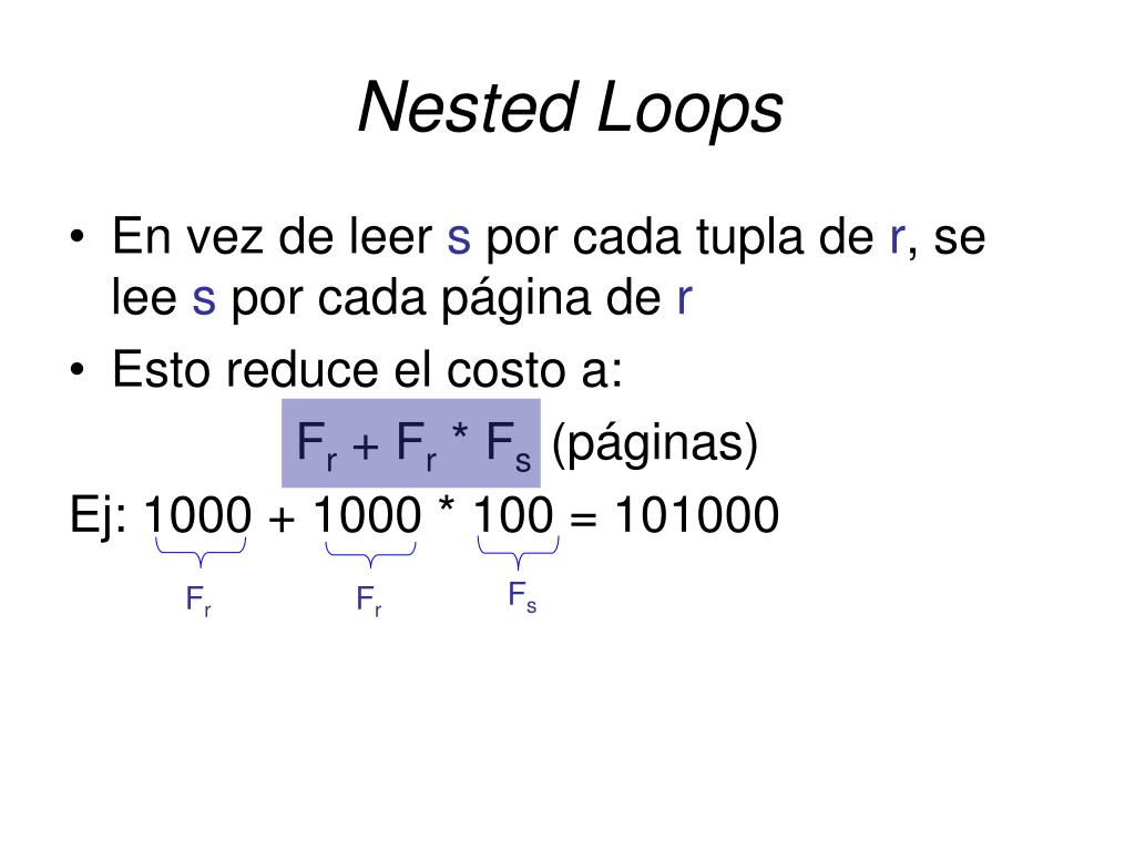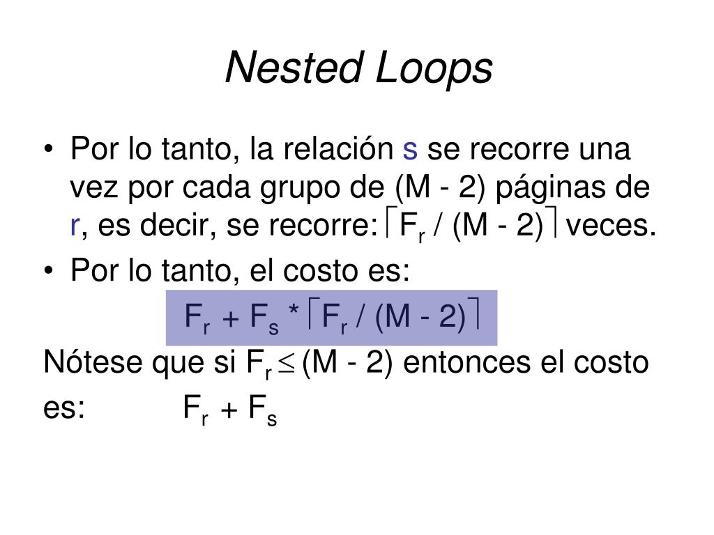 Nested Loops • Por lo tanto, la relación s se recorre una vez por cada grupo de (M - 2) páginas de r, es decir, se recorre: Fr / (M - 2) veces. • Por lo tanto, el costo es: Fr + Fs * Fr / (M - 2) Nótese que si Fr (M - 2) entonces el costo es: Fr + Fs