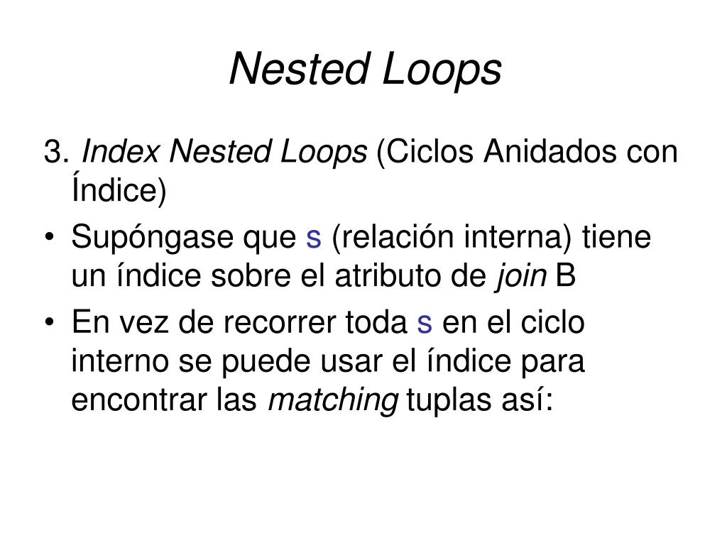 Nested Loops 3. Index Nested Loops (CiclosAnidados con Índice) • Supóngaseques (relacióninterna) tiene un índicesobre el atributo de join B • En vez de recorrertodas en el ciclointerno se puedeusar el índice para encontrarlasmatchingtuplasasí: