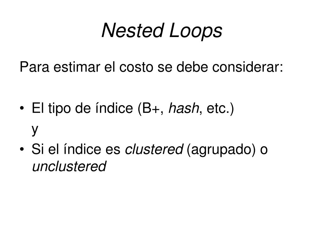 Nested Loops Para estimar el costo se debe considerar: • El tipo de índice (B+, hash, etc.) y • Si el índice es clustered (agrupado) o unclustered