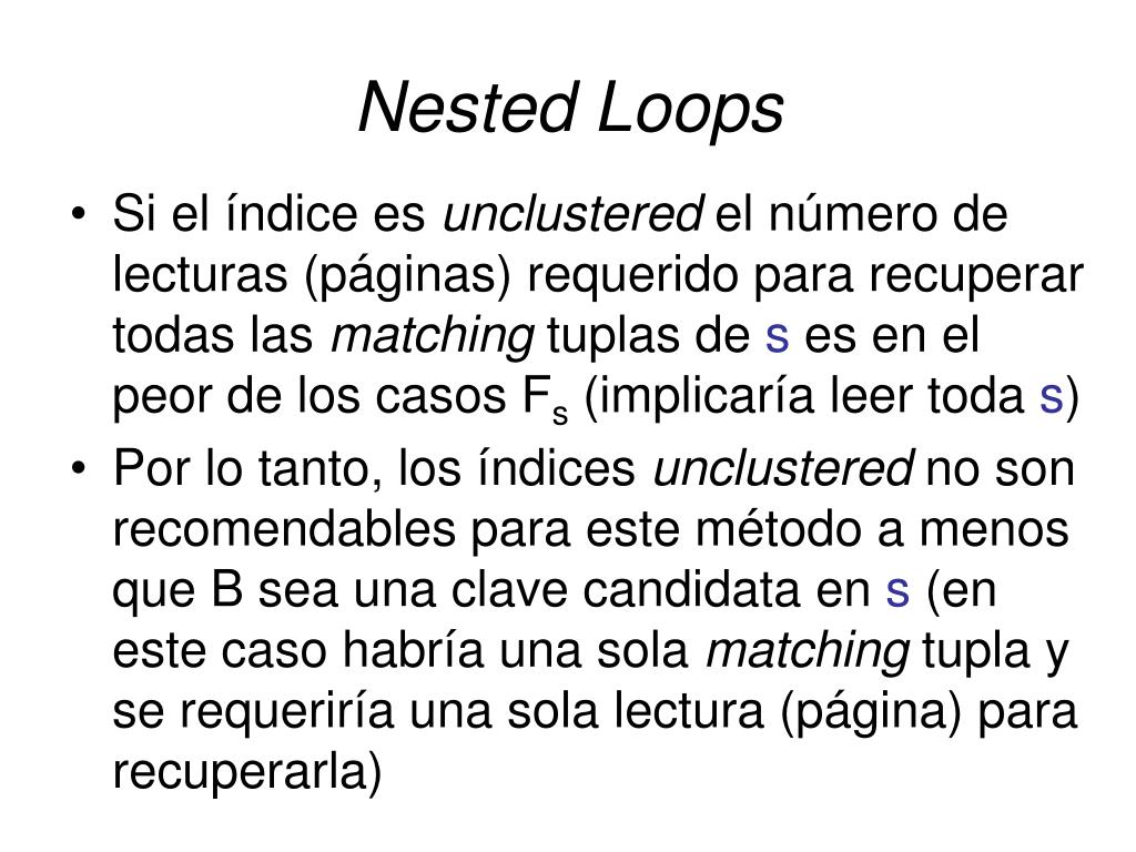Nested Loops • Si el índice es unclustered el número de lecturas (páginas) requerido para recuperar todas las matching tuplas de s es en el peor de los casos Fs (implicaría leer toda s) • Por lo tanto, los índices unclustered no son recomendables para este método a menos que B sea una clave candidata en s (en este caso habría una sola matching tupla y se requeriría una sola lectura (página) para recuperarla)