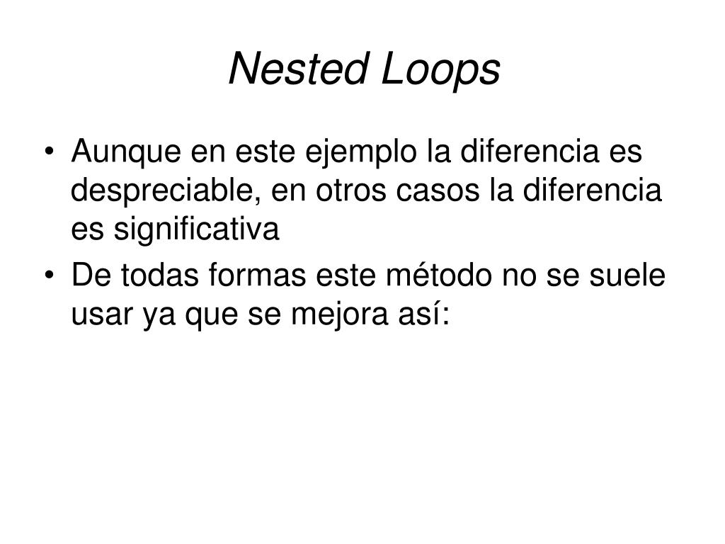 Nested Loops • Aunque en esteejemplo la diferenciaesdespreciable, en otroscasos la diferenciaessignificativa • De todasformasestemétodo no se sueleusaryaque se mejoraasí: