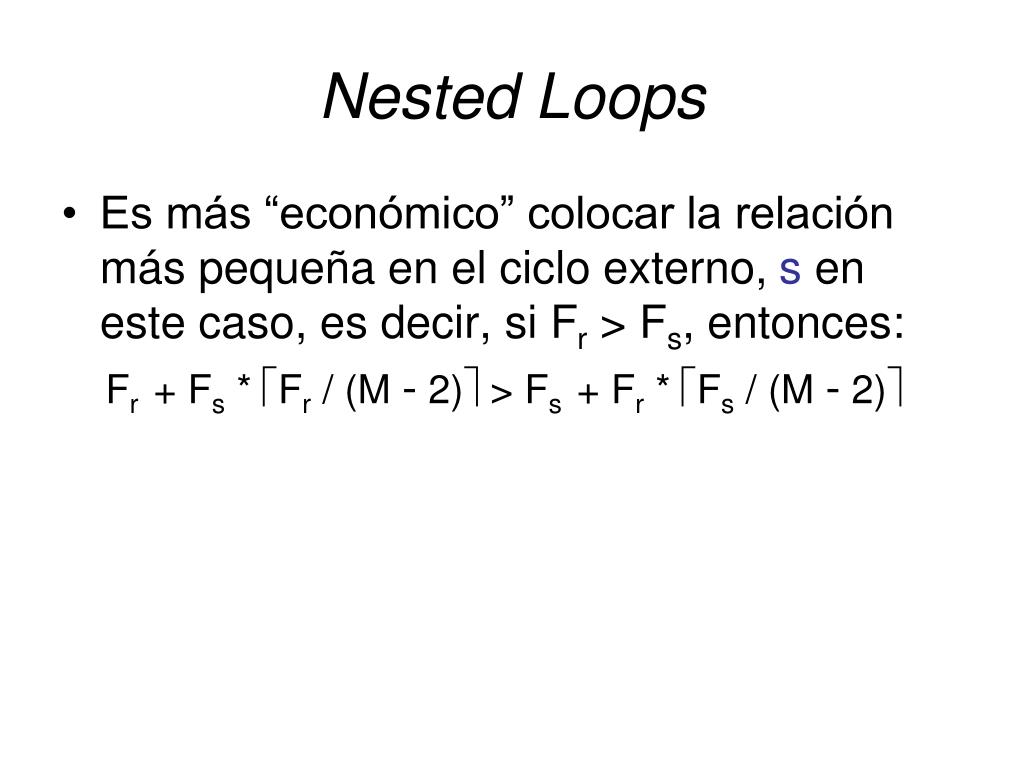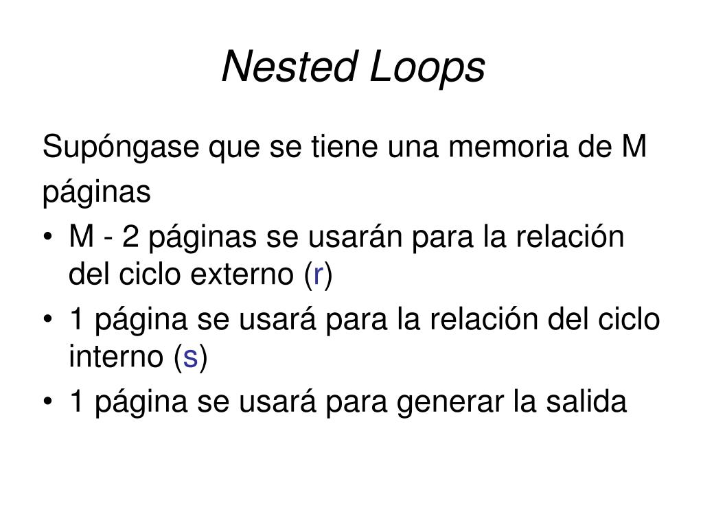 Nested Loops Supóngase que se tiene una memoria de M páginas • M - 2 páginas se usarán para la relación del ciclo externo (r) • 1 página se usará para la relación del ciclo interno (s) • 1 página se usará para generar la salida