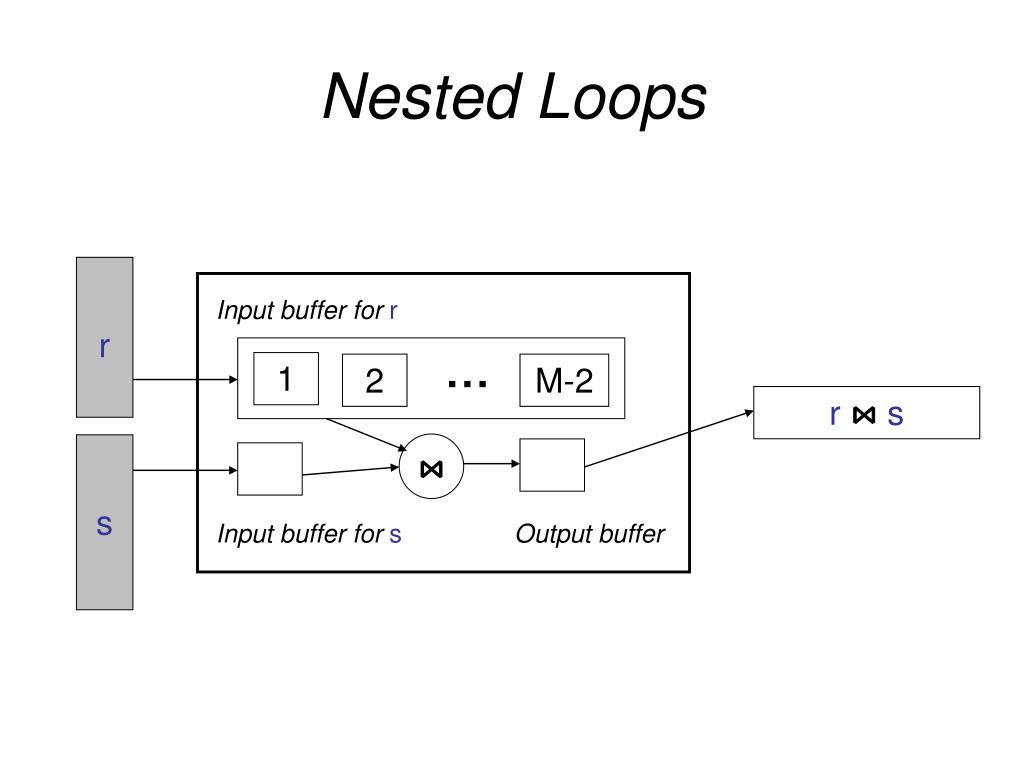 Nested Loops r Input buffer for r … 1 2 M-2 r⋈s ⋈ s Input buffer for s Output buffer