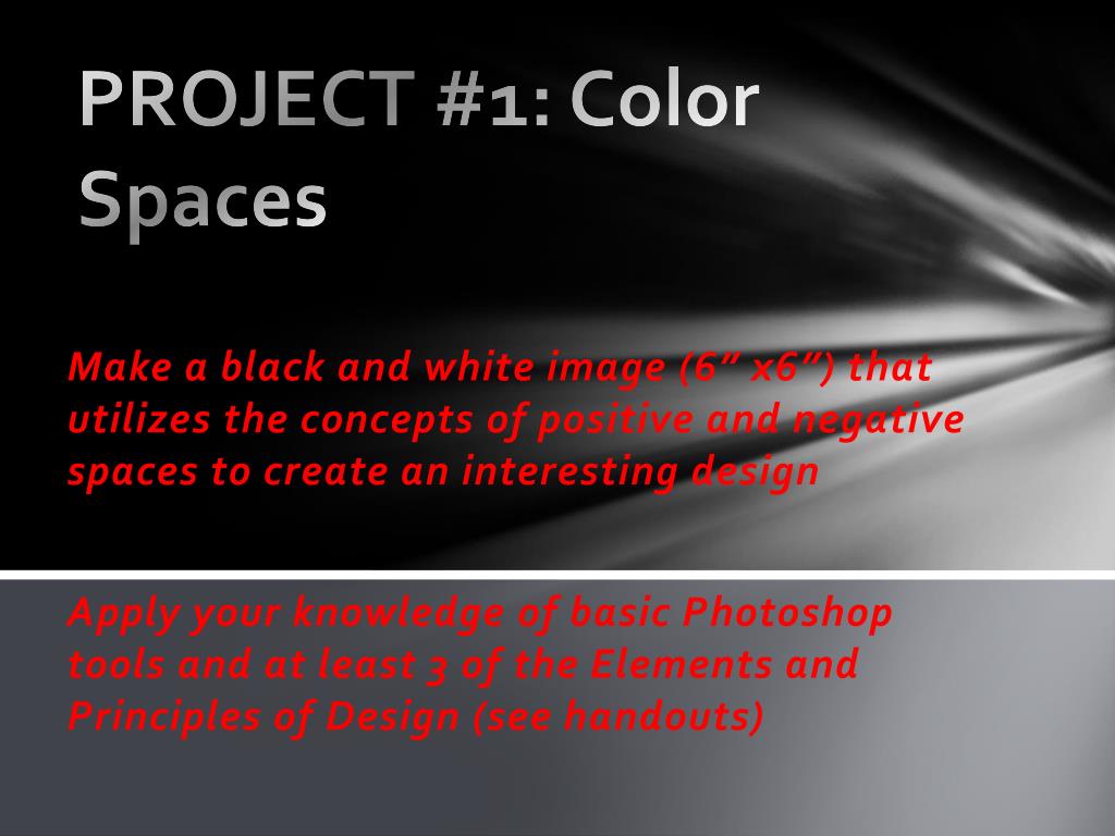 PROJECT #1: Color Spaces Make a black and white image (6” x6”) that utilizes the concepts of positive and negative spaces to create an interesting design Apply your knowledge of basic Photoshop tools and at least 3 of the Elements and Principles of Design (see handouts)