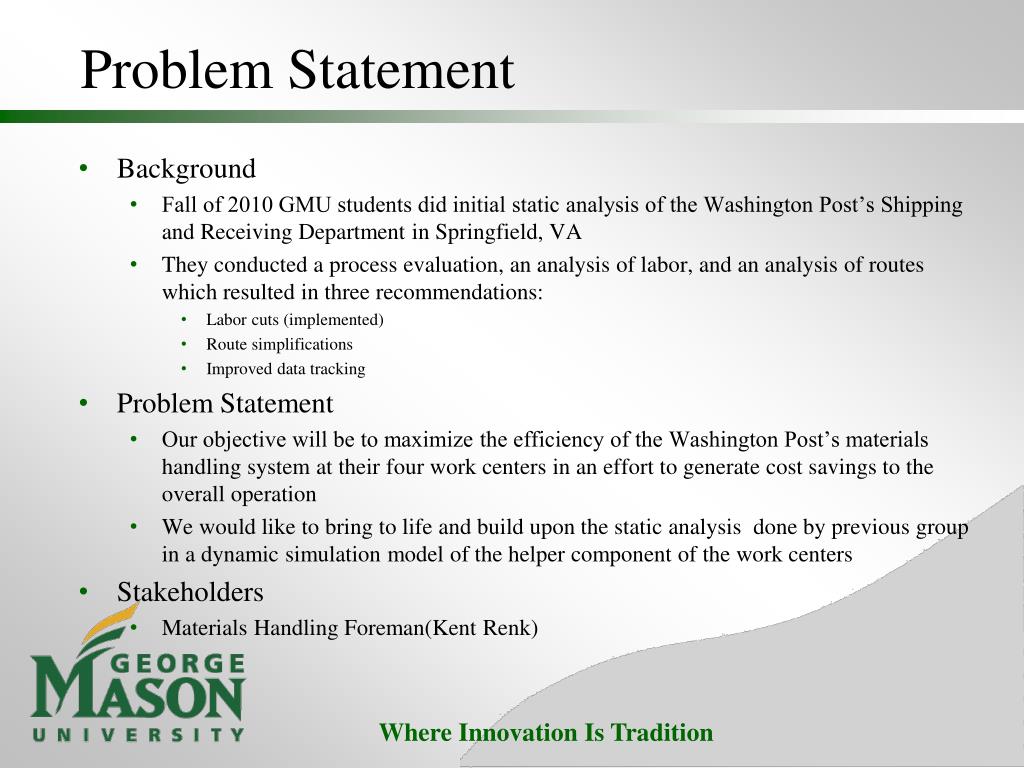 Background Fall of 2010 GMU students did initial static analysis of the Washington Post’s Shipping and Receiving Department in Springfield, VA They conducted a process evaluation, an analysis of labor, and an analysis of routes which resulted in three recommendations: Labor cuts (implemented) Route simplifications Improved data tracking Problem Statement Our objective will be to maximize the efficiency of the Washington Post’s materials handling system at their four work centers in an effort to generate cost savings to the overall operation We would like to bring to life and build upon the static analysis done by previous group in a dynamic simulation model of the helper component of the work centers Stakeholders Materials Handling Foreman(Kent Renk) Problem Statement