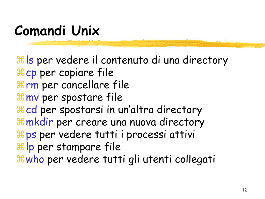 Comandi Unix • ls per vedere il contenuto di una directory • cp per copiare file • rm per cancellare file • mv per spostare file • cd per spostarsi in un’altra directory • mkdir per creare una nuova directory • ps per vedere tutti i processi attivi • lp per stampare file • who per vedere tutti gli utenti collegati