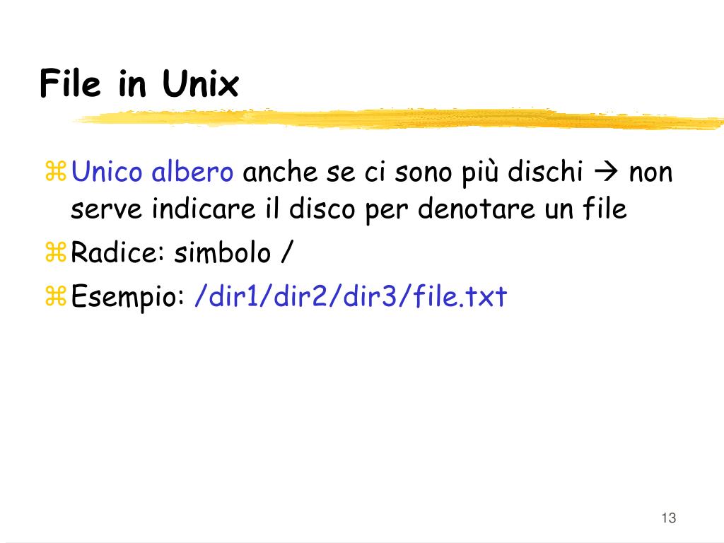 File in Unix • Unico albero anche se ci sono più dischi non serve indicare il disco per denotare un file • Radice: simbolo / • Esempio: /dir1/dir2/dir3/file.txt
