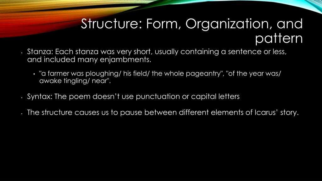 Structure: Form, Organization, and pattern • Stanza: Each stanza was very short, usually containing a sentence or less, and included many enjambments. • "a farmer was ploughing/ his field/ the whole pageantry", "of the year was/ awake tingling/ near". • Syntax: The poem doesn’t use punctuation or capital letters • The structure causes us to pause between different elements of Icarus’ story.