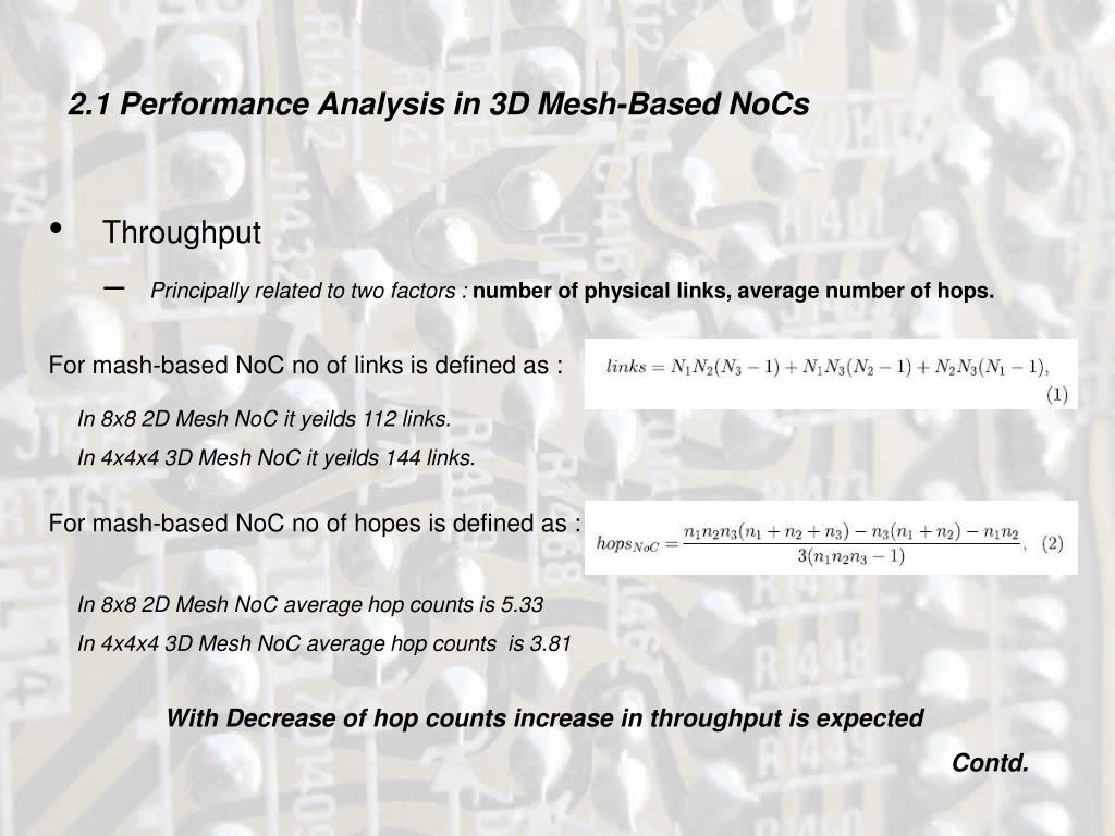2.1 Performance Analysis in 3D Mesh-Based NoCs • Throughput • Principally related to two factors : number of physical links, average number of hops. For mash-based NoC no of links is defined as : In 8x8 2D Mesh NoC it yeilds 112 links. In 4x4x4 3D Mesh NoC it yeilds 144 links. For mash-based NoC no of hopes is defined as : In 8x8 2D Mesh NoC average hop counts is 5.33 In 4x4x4 3D Mesh NoC average hop counts is 3.81 With Decrease of hop counts increase in throughput is expected Contd.