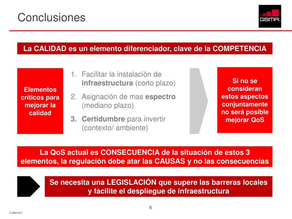 Conclusiones La CALIDAD es un elemento diferenciador, clave de la COMPETENCIA Si no se consideran estos aspectos conjuntamente no será posible mejorar QoS Elementos críticos para mejorar la calidad Facilitar la instalación de infraestructura (corto plazo) Asignación de mas espectro (mediano plazo) Certidumbre para invertir (contexto/ ambiente) La QoS actual es CONSECUENCIA de la situación de estos 3 elementos, la regulación debe atar las CAUSAS y no las consecuencias Se necesita una LEGISLACIÓN que supere las barreras locales y facilite el despliegue de infraestructura