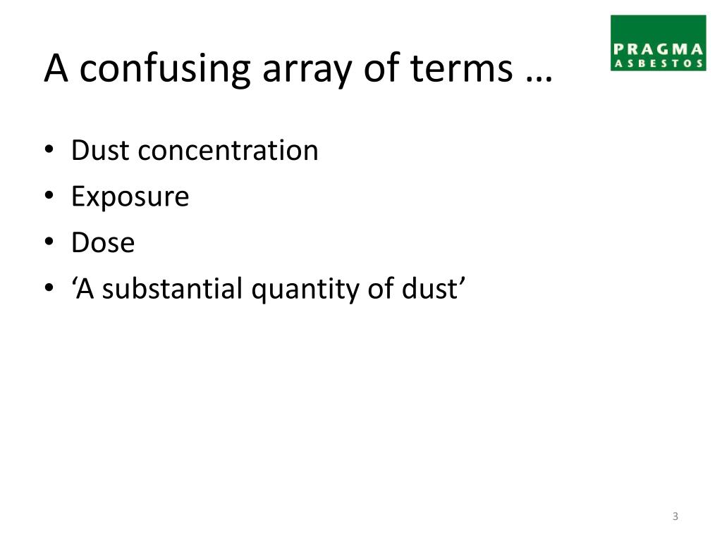 A confusing array of terms … • Dust concentration • Exposure • Dose • ‘A substantial quantity of dust’
