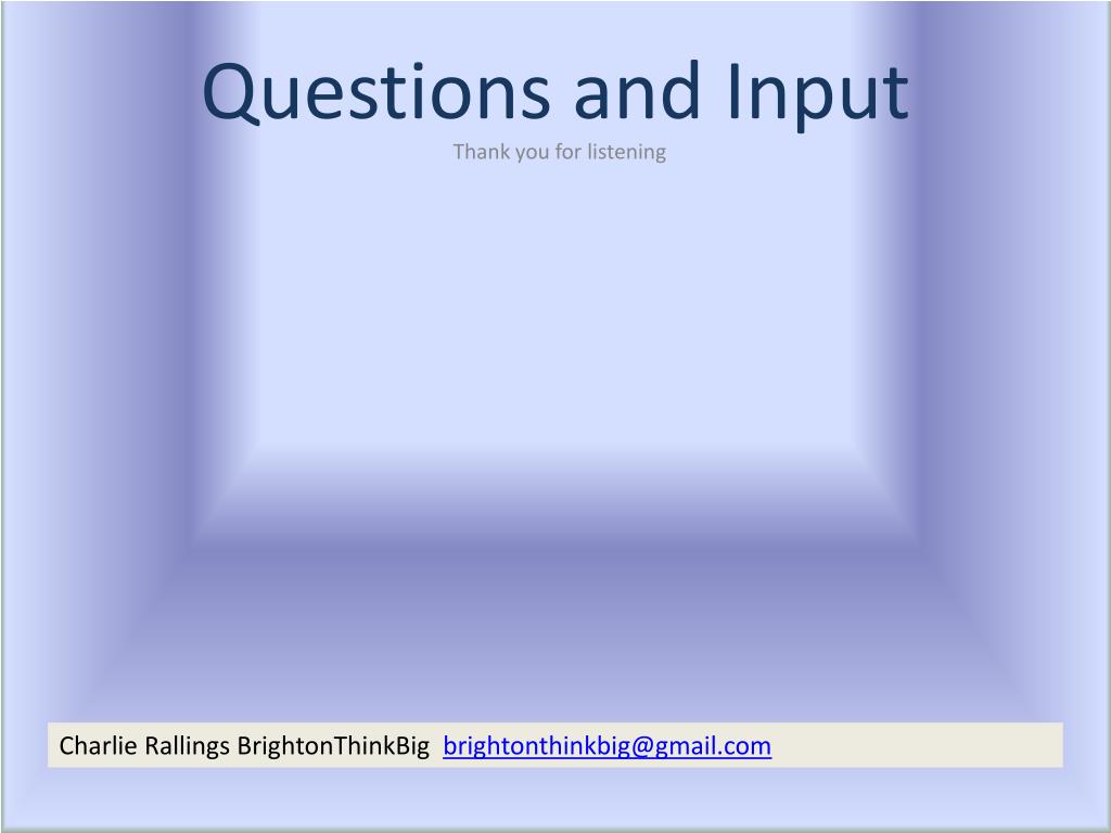 Questions and Input Thank you for listening Charlie Rallings BrightonThinkBig brightonthinkbig@gmail.com