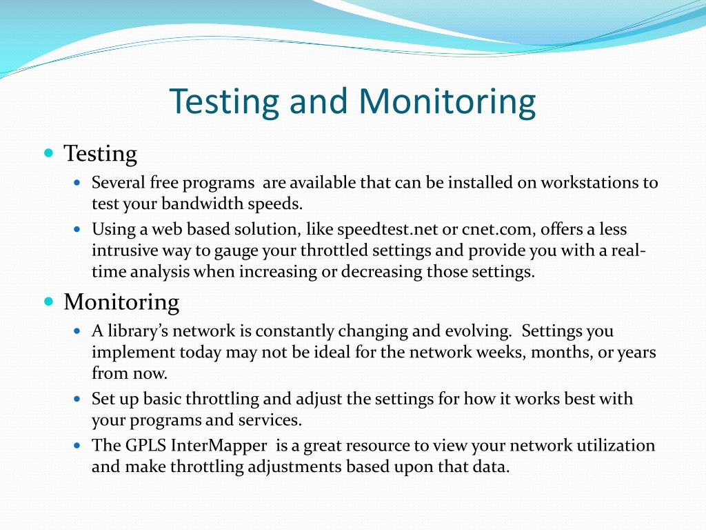 Testing and Monitoring • Testing • Several free programs are available that can be installed on workstations to test your bandwidth speeds. • Using a web based solution, like speedtest.net or cnet.com, offers a less intrusive way to gauge your throttled settings and provide you with a real-time analysis when increasing or decreasing those settings. • Monitoring • A library’s network is constantly changing and evolving. Settings you implement today may not be ideal for the network weeks, months, or years from now. • Set up basic throttling and adjust the settings for how it works best with your programs and services. • The GPLS InterMapper is a great resource to view your network utilization and make throttling adjustments based upon that data.