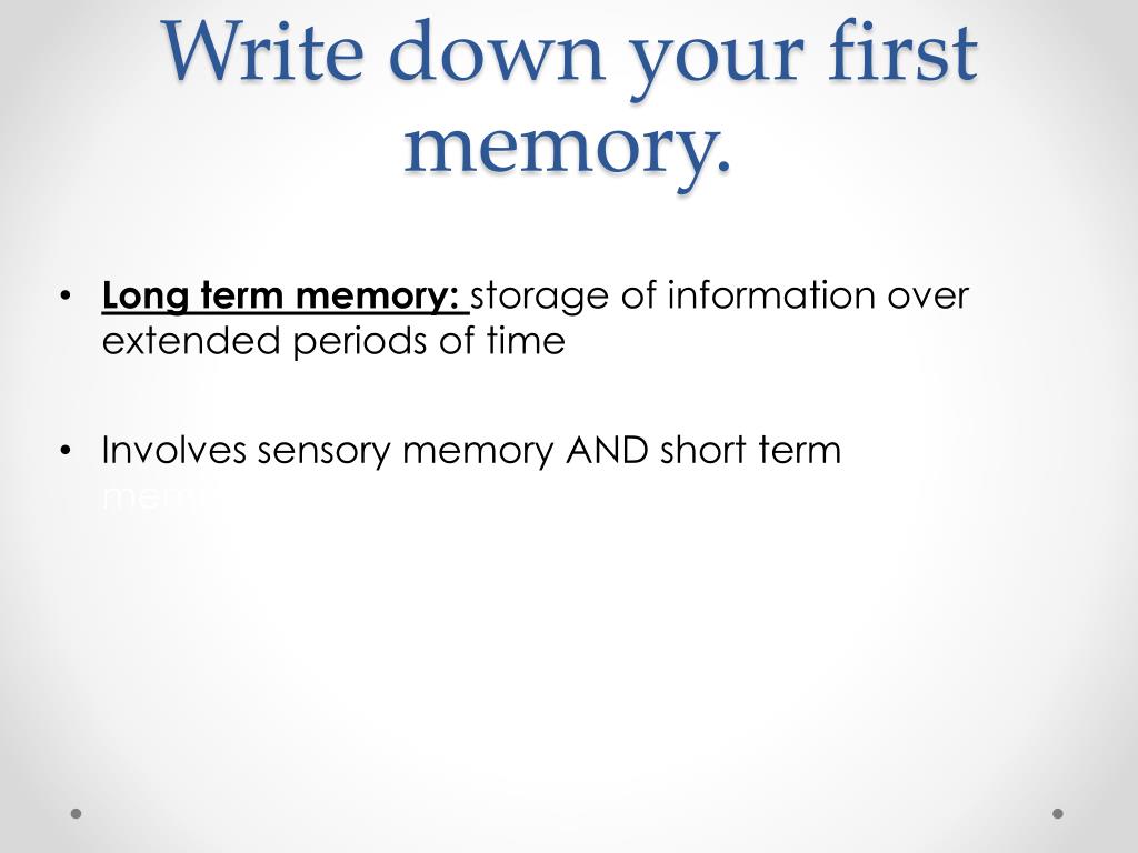 Write down your first memory. • Long term memory: storage of information over extended periods of time • Involves sensory memory AND short term term memory