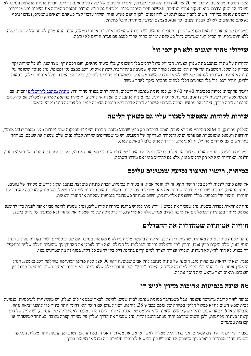 אל גבתנב תצלמומ תוינומ תרבח .םירידנ םניא סולפ העש לש םיבוכיע וליפאו ,יתרגש ןיינע אוה תוקד 40 דע 20 לש בוכיע .םיעיתפמ תוסיטה יכסמ תרוקיבמ עבנ בוכיעה םא הנתמהה תפסות תדרוה עיצת םג םיתעלו ,ריבס הנתמה ןולח רשפאת ,התיחנה ירחא בוקעת איה .םכדגנ ןמזה תא דימעת ףסונ ןוכדעו ,סוטמהמ םיאצוי םתאשכ רצק ןוכדע וחלש :רזוע טושפ םואית ןכל .םינמז חול שי גהנל םגש ןיבהל בושח .דחוימב הסומע םינוכרד .קתקתמ לכהו תרתוימ הנתמה םצמצמ גהנה ךכ .םינפה תלבק םלואל םיברקתמ םתאשכ העש יצח דע לש החזהל ןכומ גהנה הבש ,השימג ףוסיא תייצפוא תועיצמש תורבח שי .שארמ וריבסת ,ףופצ ןשקנוקמ םיאצוי םתא םהבש םירקמב .הביצי אל םיקית תלגע םע סכמל ךורא רותב םידמוע םתאשכ לודג שיגרמש ןטק לדבה הז .ףסונ בויח אלל לוז יכה קר אלו םינגוה ריחמ ילוקיש רקי תוריש לכ אל ,ינש דצמ .ףייע בכר םעו ,םיאתמ חוטיב ילב ,תינובשח ילב עיגהל לולע לוז יכה .תועצה ןווגמ הנוב גבתנב תינומ לע תורחתה לע רמושש הסונמ גהנ ,לפוטמו יקנ בצמב בכר ,ףוסיא תעשל תובייחתהב הבוגמש ףוקש ריחמ :עצמאב איה תילאירה תצבשמה .לקש לכ קידצמ תואסיכ ,הליל ,תורגא ללוכ ריחמה םא וקדב ,םידעיל םיריחמ םיוושמשכ .שבתשמ והשמשכ םג גישהל רשפאש תוחוקל תורישו ,תיארחא הגיהנ .השעמ רחאל רקיכ ררבתמ םיתעל וללה םיטרפה ילב לוז .בכר לדוגו ,םידלי םע ,תיסחי םילשוריל גבתנמ תינומ עודי ריחמ חווטב בורל היהת ,םילשוריל גבתנמ תינומ ומכ ,מ״ק 60 דע 40 תוביבסב העיסנ :תיטקרפ המגוד םא .ףדעומה לולסמלו קחרמל םאתהב ורחמותי ,הפיחל וא חלמה םיל גבתנמ תינומ ומכ ,רתוי תוכורא תועיסנ .םיגחו הליל תועשל תירשפא תפסות .שארמ עבקנו ןגוה הז דוע לכ ,ןמזל הדמצה תפסות אלל הרצק הריצע ורשפאי םיגהנ הברה .שארמ תאז ונייצ ,ךרדב הריצע ןנכותמ הטילק ןיאשכ םג וילע ךומסל רשפאש תוחוקל תוריש ,ישונא גיצנל רפסמ :עגמ תודוקנ יתש תוקפסמ תויניצר תורבח .הכחמ גהנהש ןמיס קר םיכירצ םתאו ,דבוע אל דוע ימוקמה SIM-ה ,ןקורתמ ןופלטה דחוימב ,םכמש תא גיצמש טלש םינפ תלבק תוריש םיפידעמש ימ שי .שגפמה לש תקיודמה הדוקנהו גהנה יטרפ םע תויטמוטוא פאסטוו תועדוהו .סומע םלואב לובלב עונמל ךרד וז ,קימיג אל וז .ל״וחמ םיחרוא םע םישיחרתב ןורתפ עיצמו ,שדח ןומזתב םכתא ןכדעמ ,עוריאה תא להנל עדויש תווצ לש ךרעה תא וארת ,שיבכ תולקת וא ינוציק ריווא גזמ ומכ ,םיגירח םירקמב .הנתשה והשמ םא ןמזב עידוהל םג אלא ,ןמזב עיגהל קר אל איה תוירחאה .יפולח םכילע םיניגמש העיסנ דועיתו יושיר ,תוחיטב ,םיגהנ לש רדוסמ םושירל גאדת גבתנב תצלמומ תוינומ תרבח .תיסיסב תוחיטב וז ,ןומא רסוח אל הז .ףקת יושיר ילב בכרל תולעל הביס םוש ןיא םע רתלאל הסני אל ןמוימ גהנ .לקשמו ליג יפל תוחיטב תואסיכ ושקב ,םידלי םע םילייטמ םתא םא .יתרגש לופיט םירבועש םיבכרו ,םיאתמ חוטיב .תואצוה ירזחה וא תויקסע תועיסנב רבודמשכ דחוימב בושח ,תינורטקלא תינובשח ללוכ ,העיסנה לש דועית .תורוגח ענמיהל ידכ תונפל הפיא ןיבמ הפיחל עיגמש גהנו ,םילשוריל תודיריב עגורב שולגל יתמ עדוי 1 שיבכ תא ריכמש גהנ .חטשב תדדמנ תיארחא הגיהנ .דבלב טווינ לע ךמתסמ אלו רוזאה תא ריכמש ימ לש הקיטקרפ וז ,םיקירט אל הלא .הרגא םלשל הביס ןיא םא למרכה תורהנמב רתוימ סמועמ םילדבהה תא תודדחמש תויתימא תויווח גהנה .הניעט תודוקנ יתשו םירטסוב ינש םע ,גבתנב תומוקמ 6 הלודג תינומ השקיב החוקלה .ןבל הליל התצחש תרחואמ הסיט ,רקוב תונפל ונתחנ לפקתתו המלש הלעת הלגעהש ךכ ןוסחאה תא ןגראל חרט אוה .הלגעה לע תונלבסב המדרנ הדליהש דבל ןיבהו ,תמא ןמזב םוקימ חלש ,ןמזב עיגה .ןוכנ שיגרמש המ הז ףוסב .הקד לכ בשחל ילב קלד תנחתב םירק םימל הרצק הריצע וליפאו ,תורעה אל ,ץחל היה אל .ףוסב קר גהנה .עצמאב בכר תפלחהב המייתסה ןמדזמ קפס לצא 90 הקד העצובש ביבא לתל גבתנמ תינומ לש הנמזה .בוט תוחפ םג תוארל יל אצי ,דגנמ ןמז זובזב תשוחתב טושפ ,ןוסאב רבודמ אל .הניוצ אלש הליל תפסות בקע ”ץפק“ ריחמה .החישק הדווזמל םוקמ ילב עיגה ינשה ,רחיא ןושארה .הז תא ךסוח היה שארמ רצק 