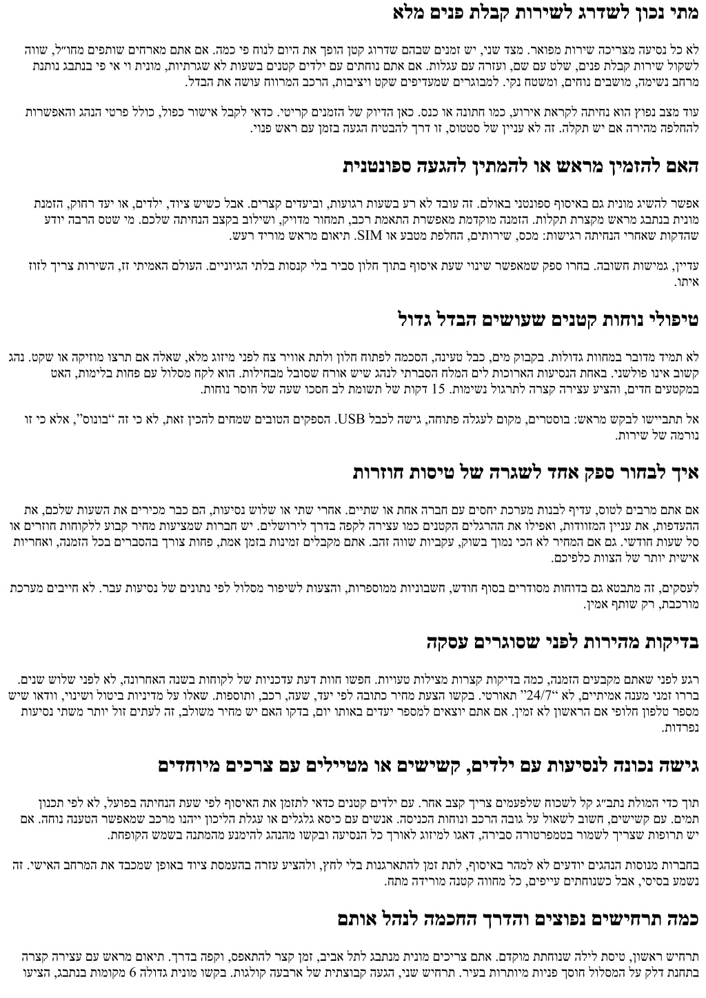 אלמ םינפ תלבק תורישל גרדשל ןוכנ יתמ הווש ,ל״וחמ םיפתוש םיחראמ םתא םא .המכ יפ חונל םויה תא ךפוה ןטק גורדש םהבש םינמז שי ,ינש דצמ .ראופמ תוריש הכירצמ העיסנ לכ אל תנתונ גבתנב יפ יא יו תינומ ,תויתרגש אל תועשב םינטק םידלי םע םיתחונ םתא םא .תולגע םע הרזעו ,םש םע טלש ,םינפ תלבק תוריש לוקשל .לדבה תא השוע חוורמה בכרה ,תוביציו טקש םיפידעמש םירגובמל .יקנ חטשמו ,םיחונ םיבשומ ,המישנ בחרמ תורשפאהו גהנה יטרפ ללוכ ,לופכ רושיא לבקל יאדכ .יטירק םינמזה לש קוידה ןאכ .סנכ וא הנותח ומכ ,עוריא תארקל התיחנ אוה ץופנ בצמ דוע .יונפ שאר םע ןמזב העגה חיטבהל ךרד וז ,סוטטס לש ןיינע אל הז .הלקת שי םא הריהמ הפלחהל תינטנופס העגהל ןיתמהל וא שארמ ןימזהל םאה תנמזה ,קוחר דעי וא ,םידלי ,דויצ שישכ לבא .םירצק םידעיבו ,תועוגר תועשב ער אל דבוע הז .םלואב ינטנופס ףוסיאב םג תינומ גישהל רשפא עדוי הברה סטש ימ .םכלש התיחנה בצקב בולישו ,קיודמ רוחמת ,בכר תמאתה תרשפאמ תמדקומ הנמזה .תולקת תרצקמ שארמ גבתנב תינומ .שער דירומ שארמ םואית .SIM וא עבטמ תפלחה ,םיתוריש ,סכמ :תושיגר התיחנה ירחאש תוקדהש זוזל ךירצ תורישה ,זז יתימאה םלועה .םיינויגה יתלב תוסנק ילב ריבס ןולח ךותב ףוסיא תעש יוניש רשפאמש קפס ורחב .הבושח תושימג ,ןיידע .ותיא לודג לדבה םישועש םינטק תוחונ ילופיט גהנ .טקש וא הקיזומ וצרת םא הלאש ,אלמ גוזימ ינפל חצ ריווא תתלו ןולח חותפל המכסה ,הניעט לבכ ,םימ קובקב .תולודג תווחמב רבודמ דימת אל טאה ,תומילב תוחפ םע לולסמ חקל אוה .תוליחבמ לבוסש חרוא שיש גהנל יתרבסה חלמה םיל תוכוראה תועיסנה תחאב .ינשלופ וניא בושק .תוחונ רסוח לש העש וכסח בל תמושת לש תוקד 15 .תומישנ לוגרתל הרצק הריצע עיצהו ,םידח םיעטקמב וז יכ אלא ,”סונוב“ הז יכ אל ,תאז ןיכהל םיחמש םיבוטה םיקפסה .USB לבכל השיג ,החותפ הלגעל םוקמ ,םירטסוב :שארמ שקבל ושייבתת לא .תוריש לש המרונ תורזוח תוסיט לש הרגשל דחא קפס רוחבל ךיא תא ,םכלש תועשה תא םיריכמ רבכ םה ,תועיסנ שולש וא יתש ירחא .םייתש וא תחא הרבח םע םיסחי תכרעמ תונבל ףידע ,סוטל םיברמ םתא םא וא םירזוח תוחוקלל עובק ריחמ תועיצמש תורבח שי .םילשוריל ךרדב הפקל הריצע ומכ םינטקה םילגרהה תא וליפאו ,תודווזמה ןיינע תא ,תופדעהה תוירחאו ,הנמזה לכב םירבסהב ךרוצ תוחפ ,תמא ןמזב תונימז םילבקמ םתא .בהז הווש תויבקע ,קושב ךומנ יכה אל ריחמה םא םג .ישדוח תועש לס .םכיפלכ תווצה לש רתוי תישיא תכרעמ םיבייח אל .רבע תועיסנ לש םינותנ יפל לולסמ רופישל תועצהו ,תורפסוממ תוינובשח ,שדוח ףוסב םירדוסמ תוחודב םג אטבתמ הז ,םיקסעל .ןימא ףתוש קר ,תבכרומ הקסע םירגוסש ינפל תוריהמ תוקידב .םינש שולש ינפל אל ,הנורחאה הנשב תוחוקל לש תוינכדע תעד תווח ושפח .תויועט תוליצמ תורצק תוקידב המכ ,הנמזה םיעבקמ םתאש ינפל עגר שיש ואדוו ,יונישו לוטיב תוינידמ לע ולאש .תופסותו ,בכר ,העש ,דעי יפל הבותכ ריחמ תעצה ושקב .יטרואת ”24/7“ אל ,םייתימא הנעמ ינמז וררב תועיסנ יתשמ רתוי לוז םיתעל הז ,בלושמ ריחמ שי םאה וקדב ,םוי ותואב םידעי רפסמל םיאצוי םתא םא .ןימז אל ןושארה םא יפולח ןופלט רפסמ .תודרפנ םידחוימ םיכרצ םע םילייטמ וא םישישק ,םידלי םע תועיסנל הנוכנ השיג ןונכת יפל אל ,לעופב התיחנה תעש יפל ףוסיאה תא ןמזתל יאדכ םינטק םידלי םע .רחא בצק ךירצ םימעפלש חוכשל לק ג״בתנ תלומה ידכ ךות םא .החונ הנעטה רשפאמש בכרמ ונהיי ןוכילה תלגע וא םילגלג אסיכ םע םישנא .הסינכה תוחונו בכרה הבוג לע לואשל בושח ,םישישק םע .םימת .תחפוקה שמשב הנתמהמ ענמיהל גהנהמ ושקבו העיסנה לכ ךרואל גוזימל וגאד ,הריבס הרוטרפמטב רומשל ךירצש תופורת שי הז .ישיאה בחרמה תא דבכמש ןפואב דויצ תסמעהב הרזע עיצהלו ,ץחל ילב תונגראתהל ןמז תתל ,ףוסיאב רהמל אל םיעדוי םיגהנה תוסונמ תורבחב .חתמ הדירומ הנטק הווחמ לכ ,םיפייע םיתחונשכ לבא ,יסיסב עמשנ םתוא להנל המכחה ךרדהו םיצופנ םישיחרת המכ הרצק הריצע םע שארמ םואית .ךרדב הפקו ,ספאתהל רצק ןמז ,ביבא לתל גבתנמ תינומ םיכירצ םתא .םדקומ תתחונש הליל תס
