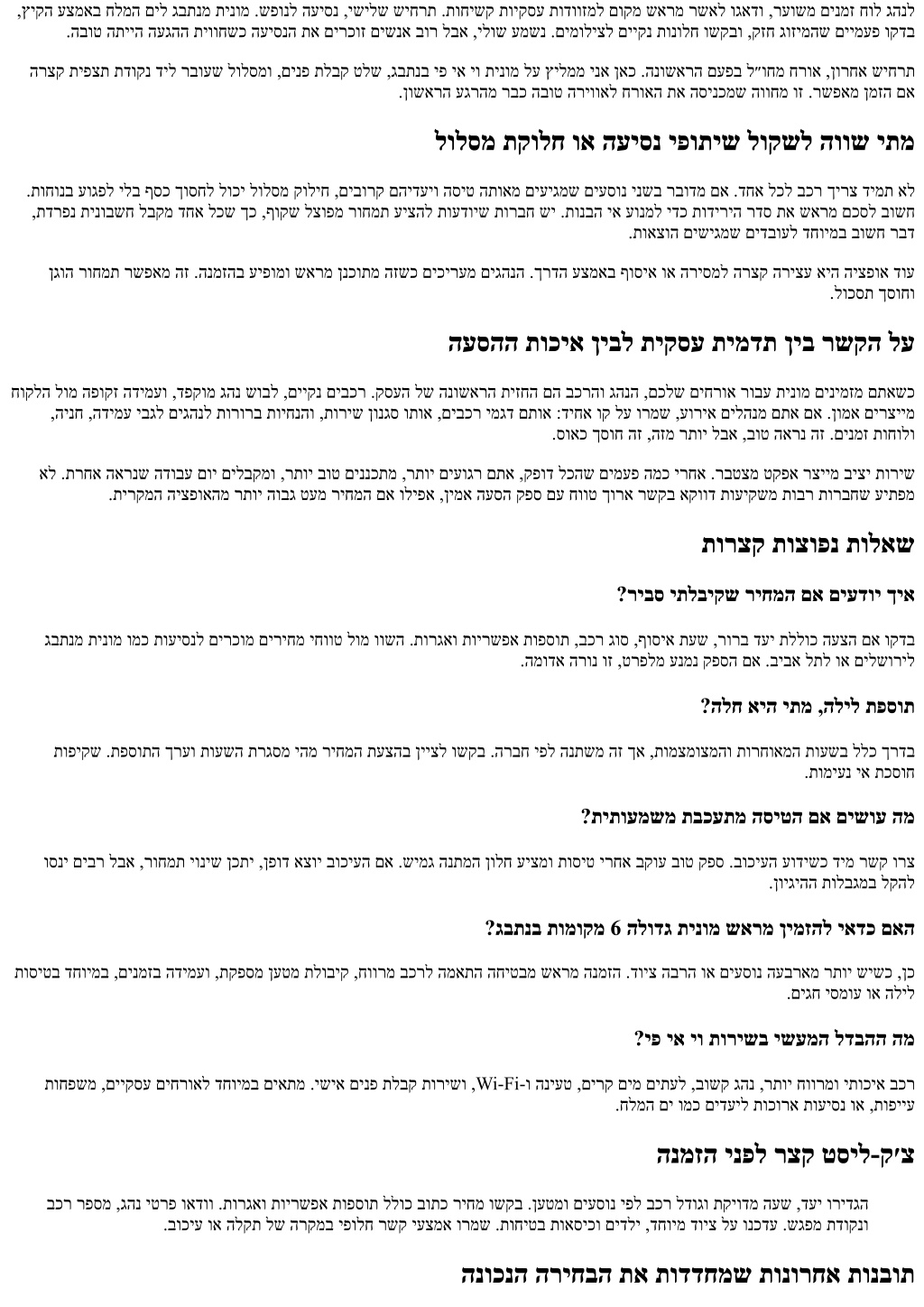 ,ץיקה עצמאב חלמה םיל גבתנמ תינומ .שפונל העיסנ ,ישילש שיחרת .תוחישק תויקסע תודווזמל םוקמ שארמ רשאל וגאדו ,רעושמ םינמז חול גהנל .הבוט התייה העגהה תיווחשכ העיסנה תא םירכוז םישנא בור לבא ,ילוש עמשנ .םימוליצל םייקנ תונולח ושקבו ,קזח גוזימהש םיימעפ וקדב הרצק תיפצת תדוקנ דיל רבועש לולסמו ,םינפ תלבק טלש ,גבתנב יפ יא יו תינומ לע ץילממ ינא ןאכ .הנושארה םעפב ל״וחמ חרוא ,ןורחא שיחרת .ןושארה עגרהמ רבכ הבוט הריוואל חרואה תא הסינכמש הווחמ וז .רשפאמ ןמזה םא לולסמ תקולח וא העיסנ יפותיש לוקשל הווש יתמ .תוחונב עוגפל ילב ףסכ ךוסחל לוכי לולסמ קוליח ,םיבורק םהידעיו הסיט התואמ םיעיגמש םיעסונ ינשב רבודמ םא .דחא לכל בכר ךירצ דימת אל ,תדרפנ תינובשח לבקמ דחא לכש ךכ ,ףוקש לצופמ רוחמת עיצהל תועדויש תורבח שי .תונבה יא עונמל ידכ תודיריה רדס תא שארמ םכסל בושח .תואצוה םישיגמש םידבועל דחוימב בושח רבד ןגוה רוחמת רשפאמ הז .הנמזהב עיפומו שארמ ןנכותמ הזשכ םיכירעמ םיגהנה .ךרדה עצמאב ףוסיא וא הריסמל הרצק הריצע איה היצפוא דוע .לוכסת ךסוחו העסהה תוכיא ןיבל תיקסע תימדת ןיב רשקה לע חוקלה לומ הפוקז הדימעו ,דפקומ גהנ שובל ,םייקנ םיבכר .קסעה לש הנושארה תיזחה םה בכרהו גהנה ,םכלש םיחרוא רובע תינומ םינימזמ םתאשכ ,הינח ,הדימע יבגל םיגהנל תורורב תויחנהו ,תוריש ןונגס ותוא ,םיבכר ימגד םתוא :דיחא וק לע ורמש ,עוריא םילהנמ םתא םא .ןומא םירציימ .סואכ ךסוח הז ,הזמ רתוי לבא ,בוט הארנ הז .םינמז תוחולו אל .תרחא הארנש הדובע םוי םילבקמו ,רתוי בוט םיננכתמ ,רתוי םיעוגר םתא ,קפוד לכהש םימעפ המכ ירחא .רבטצמ טקפא רציימ ביצי תוריש .תירקמה היצפואהמ רתוי הובג טעמ ריחמה םא וליפא ,ןימא העסה קפס םע חווט ךורא רשקב אקווד תועיקשמ תובר תורבחש עיתפמ תורצק תוצופנ תולאש ?ריבס יתלביקש ריחמה םא םיעדוי ךיא גבתנמ תינומ ומכ תועיסנל םירכומ םיריחמ יחווט לומ וושה .תורגאו תוירשפא תופסות ,בכר גוס ,ףוסיא תעש ,רורב דעי תללוכ העצה םא וקדב .המודא הרונ וז ,טרפלמ ענמנ קפסה םא .ביבא לתל וא םילשוריל ?הלח איה יתמ ,הליל תפסות תופיקש .תפסותה ךרעו תועשה תרגסמ יהמ ריחמה תעצהב ןייצל ושקב .הרבח יפל הנתשמ הז ךא ,תומצמוצמהו תורחואמה תועשב ללכ ךרדב .תומיענ יא תכסוח ?תיתועמשמ תבכעתמ הסיטה םא םישוע המ וסני םיבר לבא ,רוחמת יוניש ןכתי ,ןפוד אצוי בוכיעה םא .שימג הנתמה ןולח עיצמו תוסיט ירחא בקוע בוט קפס .בוכיעה עודישכ דימ רשק ורצ .ןויגיהה תולבגמב לקהל ?גבתנב תומוקמ 6 הלודג תינומ שארמ ןימזהל יאדכ םאה תוסיטב דחוימב ,םינמזב הדימעו ,תקפסמ ןעטמ תלוביק ,חוורמ בכרל המאתה החיטבמ שארמ הנמזה .דויצ הברה וא םיעסונ העבראמ רתוי שישכ ,ןכ .םיגח יסמוע וא הליל ?יפ יא יו תורישב ישעמה לדבהה המ תוחפשמ ,םייקסע םיחרואל דחוימב םיאתמ .ישיא םינפ תלבק תורישו ,Wi-Fi-ו הניעט ,םירק םימ םיתעל ,בושק גהנ ,רתוי חוורמו יתוכיא בכר .חלמה םי ומכ םידעיל תוכורא תועיסנ וא ,תופייע הנמזה ינפל רצק טסיל-ק׳צ בכר רפסמ ,גהנ יטרפ ואדוו .תורגאו תוירשפא תופסות ללוכ בותכ ריחמ ושקב .ןעטמו םיעסונ יפל בכר לדוגו תקיודמ העש ,דעי ורידגה .בוכיע וא הלקת לש הרקמב יפולח רשק יעצמא ורמש .תוחיטב תואסיכו םידלי ,דחוימ דויצ לע ונכדע .שגפמ תדוקנו הנוכנה הריחבה תא תודדחמש תונורחא תונבות