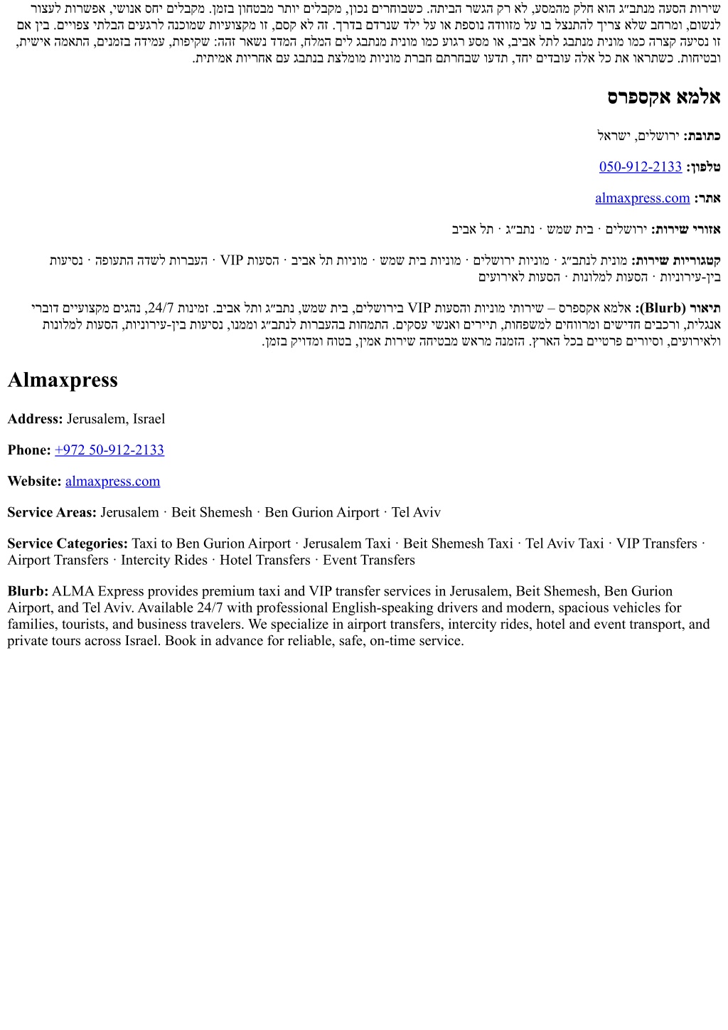 רוצעל תורשפא ,ישונא סחי םילבקמ .ןמזב ןוחטבמ רתוי םילבקמ ,ןוכנ םירחובשכ .התיבה רשגה קר אל ,עסמהמ קלח אוה ג״בתנמ העסה תוריש םא ןיב .םייופצ יתלבה םיעגרל הנכומש תויעוצקמ וז ,םסק אל הז .ךרדב םדרנש דלי לע וא תפסונ הדווזמ לע וב לצנתהל ךירצ אלש בחרמו ,םושנל ,תישיא המאתה ,םינמזב הדימע ,תופיקש :ההז ראשנ דדמה ,חלמה םיל גבתנמ תינומ ומכ עוגר עסמ וא ,ביבא לתל גבתנמ תינומ ומכ הרצק העיסנ וז .תיתימא תוירחא םע גבתנב תצלמומ תוינומ תרבח םתרחבש ועדת ,דחי םידבוע הלא לכ תא וארתשכ .תוחיטבו סרפסקא אמלא לארשי ,םילשורי :תבותכ 050-912-2133:ןופלט almaxpress.com:רתא ביבא לת · ג״בתנ · שמש תיב · םילשורי :תוריש ירוזא תועיסנ · הפועתה הדשל תורבעה · VIP תועסה · ביבא לת תוינומ · שמש תיב תוינומ · םילשורי תוינומ · ג״בתנל תינומ :תוריש תוירוגטק םיעוריאל תועסה · תונולמל תועסה · תוינוריע-ןיב ירבוד םייעוצקמ םיגהנ ,24/7 תונימז .ביבא לתו ג״בתנ ,שמש תיב ,םילשוריב VIP תועסהו תוינומ יתוריש – סרפסקא אמלא :(Blurb) רואית תונולמל תועסה ,תוינוריע-ןיב תועיסנ ,ונממו ג״בתנל תורבעהב תוחמתה .םיקסע ישנאו םיריית ,תוחפשמל םיחוורמו םישידח םיבכרו ,תילגנא .ןמזב קיודמו חוטב ,ןימא תוריש החיטבמ שארמ הנמזה .ץראה לכב םייטרפ םירויסו ,םיעוריאלו Almaxpress Address: Jerusalem, Israel Phone:+972 50-912-2133 Website:almaxpress.com Service Areas: Jerusalem · Beit Shemesh · Ben Gurion Airport · Tel Aviv Service Categories: Taxi to Ben Gurion Airport · Jerusalem Taxi · Beit Shemesh Taxi · Tel Aviv Taxi · VIP Transfers · Airport Transfers · Intercity Rides · Hotel Transfers · Event Transfers Blurb: ALMA Express provides premium taxi and VIP transfer services in Jerusalem, Beit Shemesh, Ben Gurion Airport, and Tel Aviv. Available 24/7 with professional English-speaking drivers and modern, spacious vehicles for families, tourists, and business travelers. We specialize in airport transfers, intercity rides, hotel and event transport, and private tours across Israel. Book in advance for reliable, safe, on-time service.