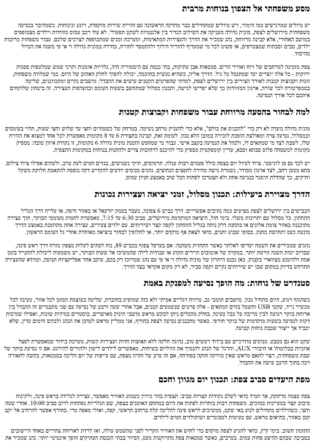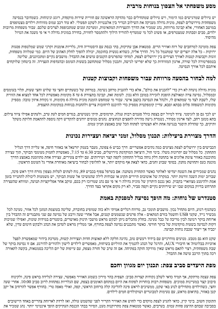 .הקיתעה ריעה לש םלשומ םיירפ הקינעמש העודי תוחפ תיפצת תדוקנל הרצקה היילעה ומכ ,תוידדצ תוסינכו םוליצ תויווז עיצי לילגה םיבושחה םיעגרל תויגרנאה תא םיכסוחשכ :ךרדהמ ןטק רופיס טקש שקיב אבא ,עצמאב תרדוסמ תחא הריצע השקיב אמא .תפצל םילשורימ תמדקומ העיסנ המאית תושפנ העבש לש החפשמ ,םישדוח המכ ינפל .רצק יפולח שיבכ ךרד ונפלחו םסק ףלחמ ינפל לק סמוע וניהיז ,6:40-ב ונאצי .םיירט םיפאמ לע ומלח םידליהו ,ךרדה תליחתב הרצק הדיעו תחישל ,תישארה הרדשהמ סנכיהל םוקמב ,תפצב רבכ .רונתהמ ואצי עגרהש םיסקרוב לש םיפדמו םייקנ םיתוריש םע םוקמב קוידב ,םינולא תמוצב ונרצע ,רתוי םדקומ תוקד 20 ונאצי ,םילייטמה לכ םע הכוראה הדיריב עקתיהל םוקמב ,םויה םויסב .בורק ןוינחל הריהמ השיג ןתנש ידדצ בוחרמ ונסנכנ לבא ,תובר ךותמ תחא המגוד וז .שאר באכ ילבו בג יבאכ ילב ,םיננער תיבב ודרי םה .ומדרנ םידליהש ןמזב םילשוריל ונשלגו הניפ שאר ךרד וניצח .החפשמל תמאתומש יפ יא יו הלודג תינומו ןוכנ ןונכת השוע המ השיחממ איה יטרפ בכרב תוחצנמ תויטרפ תועסה יתמ תותבשב וא ריעב םיעוריא ביבס דחוימב ,עיתפהל םילוכי תפצב הינח יסמוע .ךורא םויל ןוכנה אוה דימת אל לבא ,הטילש תשוחת קינעמ יטרפ בכר הלודג תינומ .הרואכל ןוכסיחה תא םיווש דימת אל םה הכילה םוי ירחא הגיהנה לע האלמ תוירחאו תורצ תואטמסב ןורמת ,הינח שופיח .תישמש ןובשח לע האבה הדוקנל ךישמהל םיבייח אל ,םיפייע םידליהש םיאור םא .ןונכתה תא ביחרהל םכל תרשפאמ םג לעופבו ,הלא לכ תא תענומ תודוקנל ברקתהל רשפא ,הכילהב השקתמש אתבס שי םהבש םירקמב .רמיצה תלדל םכתא ריזחמ גהנהו ,טקש םוקמב םירצוע ,ןוויכ םינשמ :הגיהנה .הרובחת קר אל ,תוכיא ןמז תרציימש תושימגב רבודמ .תוכילה תורצקמש היילע-הדירי ןגוה תויפיצ םואיתו םיריחמ יחווט ומכ תודחוימ תושקב ,איש תונוע ,העשו םוי ,םיעסונה רפסמ ,בכרה לדוג :םירטמרפ רפסממ עפשומ תפצל םילשורימ הלודג תינומב העיסנ ריחמ 7 דע 6 לש החפשמ רובע ךא ,םוימירפ ןיבל הליגר העיסנ לש םיריחמ ןיב בורל עוני לבוקמה חווטה .תובותכ רפסמב רוזיפ וא תופסונ תוריצע לבקל בושח .םלתשמ ףאו זזקתמ םיתעל - גהנה תופייעו הינח ,קלד ,תויטרפ תוינוכמ יתש לומ שרפהה ,לעופב תישענ עסונל הקולחהשכ ,םיעסונ ללוכ ריחמה םאהו ,שי םא הרגא ירשג ,תוחיטב יבשומ תולע ,םיגירח העונת יסמוע ,תונתמה :אל המו לולכ המ ןויצ םע ,שארמ תטרופמ ריחמ תעצה .ההובג המרב יטרפ תורישב חתפמ תדוקנ וזו ,תויומיענ יא תכסוח תופיקש .מ"עמ םידליל םיבשומ להונו תונוישר ,הניקת :לכה ינפל תוחיטב וב שישו ,תויתפוקת תוקידב רבעש ,ןרצי רפס יפל קזחותמ בכרהש אדוול שי .תוחיטב לש תימצעה הפיכאה תמר אוה םיקפס ןיב יתועמשמ לדבה יאדכ ,ךכל רבעמ .וקפוסי םיבשומ וליא ןכדעיו םידליה יאליג תא שארמ לאשי יתוכיא גהנ .םידליה הבוגלו ליגל םאתהב םירטסוב וא תוחיטב יבשומ תוחפשמב יתלקתנ תחא אל .תומוקמה לכב תוניקת תוחיטבה תורוגחשו ,יטרדנטס בכר חוטיב קר אלו ,העסה תוליעפל ףיקמ חוטיב שיש קודבל ,לפרע וא דבכ םשגב הגיהנ ילהנ לע םג ולאש .שארמ םיאדוומו םיקדובשכ הרוק אל הז .םלוכל דבלב דחא רטסוב תולגל ידכ בר קחרמ ועיגהש .יארחאו רורב לוקוטורפ וקיזחי םינעוצקמה .ןורימ רהב רימחמ ריוואה גזמ םא שדחמ םואית עצבתמ דציכו םילשורימ תוישומיש תואוושה :םירחא םידעיל הריהמ הציפק לש העיסנב הסנתה רבכש ימ .םיירלופופ םילולסמ דועל המיאתמ דפקומ תורישו חוורמ בכר לש תיתשת התוא ,םידעי ןיב תוושמש תוחפשמ רובע רויסב וא םיב ימי םוי רובע הפיחל םילשורימ הלודג תינומ :תורחא תוכוראו תורצק תועיסנב המוד ןויגיה אצמי תפצל םילשורימ הלודג תינומ העיסנה וליפא וא ,ךרדב תוחורבו םוחב םחליהל םוקמב םישביו םיעוגר עיגהל םיפידעמ רשאכ חלמה םיל םילשורימ הלודג תינומ ,תינמרגה הבשומב תינומ ןימזהל רשפא ברע יעוריא וא םירודיס רובע ,דגנמ .הלופכ תועמשמ םילבקמ בחרמהו טקשה םש - תליאל םילשורימ הלודג תינומ לש הכוראה תינומ לש תורשפאה לע חמשי ןתח תבשב שמש תיבב תומולח תרידל רבועש ימ .ברעה ףוסב תו