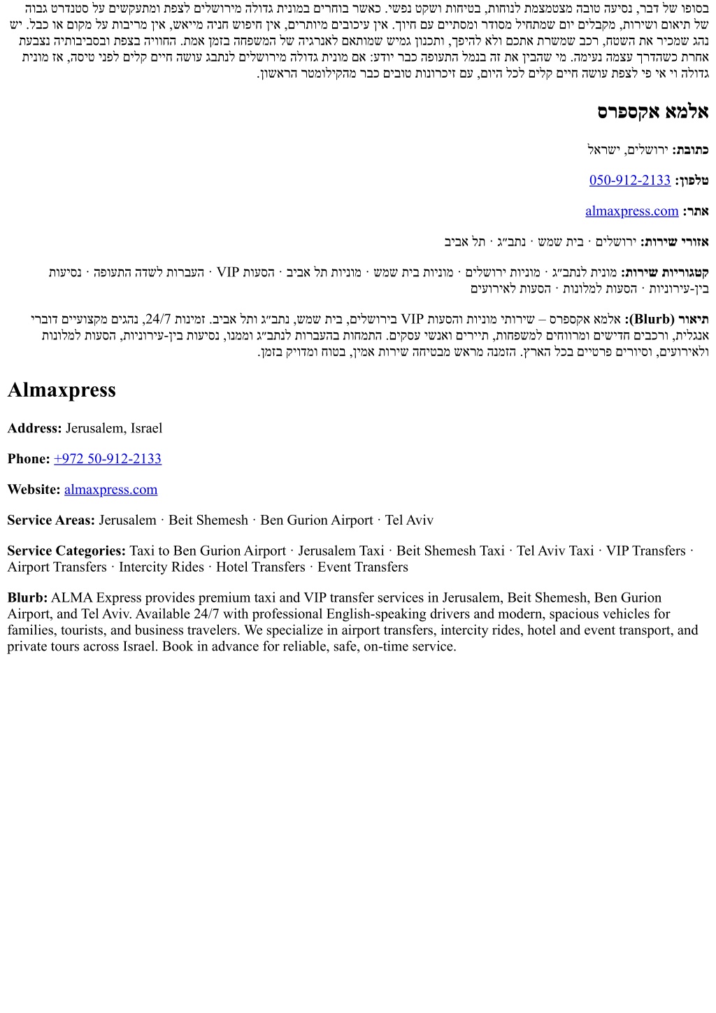 הובג טרדנטס לע םישקעתמו תפצל םילשורימ הלודג תינומב םירחוב רשאכ .ישפנ טקשו תוחיטב ,תוחונל תמצמטצמ הבוט העיסנ ,רבד לש ופוסב שי .לבכ וא םוקמ לע תובירמ ןיא ,שאיימ הינח שופיח ןיא ,םירתוימ םיבוכיע ןיא .ךויח םע םייתסמו רדוסמ ליחתמש םוי םילבקמ ,תורישו םואית לש תעבצנ היתוביבסבו תפצב היווחה .תמא ןמזב החפשמה לש היגרנאל םאתומש שימג ןונכתו ,ךפיהל אלו םכתא תרשמש בכר ,חטשה תא ריכמש גהנ תינומ זא ,הסיט ינפל םילק םייח השוע גבתנל םילשורימ הלודג תינומ םא :עדוי רבכ הפועתה למנב הז תא ןיבהש ימ .המיענ המצע ךרדהשכ תרחא .ןושארה רטמוליקהמ רבכ םיבוט תונורכיז םע ,םויה לכל םילק םייח השוע תפצל יפ יא יו הלודג סרפסקא אמלא לארשי ,םילשורי :תבותכ 050-912-2133:ןופלט almaxpress.com:רתא ביבא לת · ג״בתנ · שמש תיב · םילשורי :תוריש ירוזא תועיסנ · הפועתה הדשל תורבעה · VIP תועסה · ביבא לת תוינומ · שמש תיב תוינומ · םילשורי תוינומ · ג״בתנל תינומ :תוריש תוירוגטק םיעוריאל תועסה · תונולמל תועסה · תוינוריע-ןיב ירבוד םייעוצקמ םיגהנ ,24/7 תונימז .ביבא לתו ג״בתנ ,שמש תיב ,םילשוריב VIP תועסהו תוינומ יתוריש – סרפסקא אמלא :(Blurb) רואית תונולמל תועסה ,תוינוריע-ןיב תועיסנ ,ונממו ג״בתנל תורבעהב תוחמתה .םיקסע ישנאו םיריית ,תוחפשמל םיחוורמו םישידח םיבכרו ,תילגנא .ןמזב קיודמו חוטב ,ןימא תוריש החיטבמ שארמ הנמזה .ץראה לכב םייטרפ םירויסו ,םיעוריאלו Almaxpress Address: Jerusalem, Israel Phone:+972 50-912-2133 Website:almaxpress.com Service Areas: Jerusalem · Beit Shemesh · Ben Gurion Airport · Tel Aviv Service Categories: Taxi to Ben Gurion Airport · Jerusalem Taxi · Beit Shemesh Taxi · Tel Aviv Taxi · VIP Transfers · Airport Transfers · Intercity Rides · Hotel Transfers · Event Transfers Blurb: ALMA Express provides premium taxi and VIP transfer services in Jerusalem, Beit Shemesh, Ben Gurion Airport, and Tel Aviv. Available 24/7 with professional English-speaking drivers and modern, spacious vehicles for families, tourists, and business travelers. We specialize in airport transfers, intercity rides, hotel and event transport, and private tours across Israel. Book in advance for reliable, safe, on-time service.