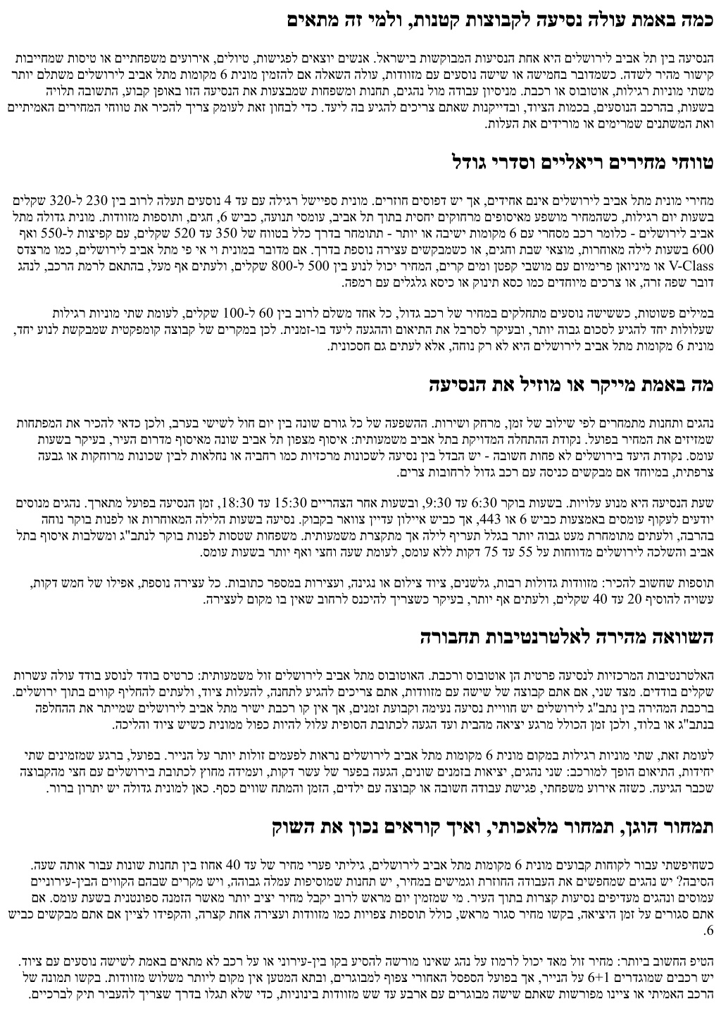 םיאתמ הז ימלו ,תונטק תוצובקל העיסנ הלוע תמאב המכ תובייחמש תוסיט וא םייתחפשמ םיעוריא ,םילויט ,תושיגפל םיאצוי םישנא .לארשיב תושקובמה תועיסנה תחא איה םילשוריל ביבא לת ןיב העיסנה רתוי םלתשמ םילשוריל ביבא לתמ תומוקמ 6 תינומ ןימזהל םא הלאשה הלוע ,תודווזמ םע םיעסונ השיש וא השימחב רבודמשכ .הדשל ריהמ רושיק היולת הבושתה ,עובק ןפואב וזה העיסנה תא תועצבמש תוחפשמו תונחת ,םיגהנ לומ הדובע ןויסינמ .תבכר וא סובוטוא ,תוליגר תוינומ יתשמ םייתימאה םיריחמה יחווט תא ריכהל ךירצ קמועל תאז ןוחבל ידכ .דעיל הב עיגהל םיכירצ םתאש תונקיידבו ,דויצה תומכב ,םיעסונה בכרהב ,תועשב .תולעה תא םידירומ וא םימירמש םינתשמה תאו לדוג ירדסו םיילאיר םיריחמ יחווט םילקש 320-ל 230 ןיב בורל הלעת םיעסונ 4 דע םע הליגר לשייפס תינומ .םירזוח םיסופד שי ךא ,םידיחא םניא םילשוריל ביבא לתמ תינומ יריחמ לתמ הלודג תינומ .תודווזמ תופסותו ,םיגח ,6 שיבכ ,העונת יסמוע ,ביבא לת ךותב תיסחי םיקוחרמ םיפוסיאמ עפשומ ריחמהשכ ,תוליגר םוי תועשב ףאו 550-ל תוציפק םע ,םילקש 520 דע 350 לש חווטב ללכ ךרדב רחמותת - רתוי וא הבישי תומוקמ 6 םע ירחסמ בכר רמולכ - םילשוריל ביבא סדצרמ ומכ ,םילשוריל ביבא לתמ יפ יא יו תינומב רבודמ םא .ךרדב תפסונ הריצע םישקבמשכ וא ,םיגחו תבש יאצומ ,תורחואמ הליל תועשב 600 גהנל ,בכרה תמרל םאתהב ,לעמ ףא םיתעלו ,םילקש 800-ל 500 ןיב עונל לוכי ריחמה ,םירק םימו ןטפק יבשומ םע םוימירפ ןאוינימ וא V-Class .הפמר םע םילגלג אסיכ וא קונית אסכ ומכ םידחוימ םיכרצ וא ,הרז הפש רבוד תוליגר תוינומ יתש תמועל ,םילקש 100-ל 60 ןיב בורל םלשמ דחא לכ ,לודג בכר לש ריחמב םיקלחתמ םיעסונ השיששכ ,תוטושפ םילימב ,דחי עונל תשקבמש תיטקפמוק הצובק לש םירקמב ןכל .תינמז-וב דעיל העגההו םואיתה תא לברסל רקיעבו ,רתוי הובג םוכסל עיגהל דחי תולולעש .תינוכסח םג םיתעל אלא ,החונ קר אל איה םילשוריל ביבא לתמ תומוקמ 6 תינומ העיסנה תא ליזומ וא רקיימ תמאב המ תוחתפמה תא ריכהל יאדכ ןכלו ,ברעב ישישל לוח םוי ןיב הנוש םרוג לכ לש העפשהה .תורישו קחרמ ,ןמז לש בוליש יפל םירחמתמ תונחתו םיגהנ תועשב רקיעב ,ריעה םורדמ ףוסיאמ הנוש ביבא לת ןופצמ ףוסיא :תיתועמשמ ביבא לתב תקיודמה הלחתהה תדוקנ .לעופב ריחמה תא םיזיזמש העבג וא תוקחורמ תונוכש ןיבל תואלחנ וא היבחר ומכ תויזכרמ תונוכשל העיסנ ןיב לדבה שי - הבושח תוחפ אל םילשוריב דעיה תדוקנ .סמוע .םירצ תובוחרל לודג בכר םע הסינכ םישקבמ םא דחוימב ,תיתפרצ םיסונמ םיגהנ .ךראתמ לעופב העיסנה ןמז ,18:30 דע 15:30 םיירהצה רחא תועשבו ,9:30 דע 6:30 רקוב תועשב .תויולע עונמ איה העיסנה תעש החונ רקוב תונפל וא תורחואמה הלילה תועשב העיסנ .קובקב ראווצ ןיידע ןולייא שיבכ ךא ,443 וא 6 שיבכ תועצמאב םיסמוע ףוקעל םיעדוי לתב ףוסיא תובלשמו ג"בתנל רקוב תונפל תוסטש תוחפשמ .תיתועמשמ תרצקתמ ךא הליל ףירעת ללגב רתוי הובג טעמ תרחמותמ םיתעלו ,הברהב .סמוע תועשב רתוי ףאו יצחו העש תמועל ,סמוע אלל תוקד 75 דע 55 לע תוחוודמ םילשוריל הכלשהו ביבא ,תוקד שמח לש וליפא ,תפסונ הריצע לכ .תובותכ רפסמב תוריצעו ,הניגנ וא םוליצ דויצ ,םינשלג ,תובר תולודג תודווזמ :ריכהל בושחש תופסות .הריצעל םוקמ וב ןיאש בוחרל סנכיהל ךירצשכ רקיעב ,רתוי ףא םיתעלו ,םילקש 40 דע 20 ףיסוהל היושע הרובחת תוביטנרטלאל הריהמ האוושה תורשע הלוע דדוב עסונל דדוב סיטרכ :תיתועמשמ לוז םילשוריל ביבא לתמ סובוטואה .תבכרו סובוטוא ןה תיטרפ העיסנל תויזכרמה תוביטנרטלאה .םילשורי ךותב םיווק ףילחהל םיתעלו ,דויצ תולעהל ,הנחתל עיגהל םיכירצ םתא ,תודווזמ םע השיש לש הצובק םתא םא ,ינש דצמ .םידדוב םילקש הפלחהה תא רתיימש םילשוריל ביבא לתמ רישי תבכר וק ןיא ךא ,םינמז תעובקו המיענ העיסנ תייווח שי םילשוריל ג"בתנ ןיב הריהמה תבכרב .הכילהו דויצ שישכ תינוממ לופכ תויהל לולע תיפוסה תבותכל העגה דעו תיבהמ האיצי עגרמ ללוכה ןמז ןכלו ,דולב וא ג"בתנב יתש םינימזמש עגרב ,לעופב .ריינה לע רתוי תולוז םימעפל תוארנ םילשוריל ביבא לתמ תומוק