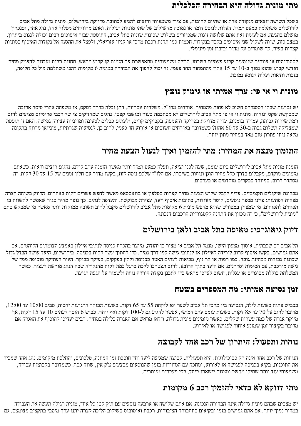 וקלח .םילשוריל ביבא לתמ תומוקמ 6 תינומל תחאו הליגר תינומל תחא ,ריחמ תועצה יתש ושקב :טושפ בושיח ועצב ,הדידמ היצקידניא לבקל ידכ אל םתא דוע לכ ,תוליגר תוינומ יתשל סחיב םלתשמ ללכ ךרדב עסונל םילקש 90 דע םוכס לכ ,השיש םתא םא .םיעסונה רפסמב ריחמה תא ילב הז לעמ ץפוק ריחמה םא .קוידו ,ןמז ,תוחונ ןובשחב תחקלנשכ ריבס ןיידע עסונל םילקש 100 דע ,השימח םתא םא .תובר תוריצע םיפיסומ .האיציה ןמזב תושימג וקדב וא תפסונ הנחת ושפח ,ןיעל תיארנ הביס ינוריעה חטשב תואיצמ תקידב 10 דוע הפיסומ תויררה תונוכשל תיפוסה השיגה ,םילשוריב .תוקד 20 תחקל הלוכי סמוע תועשב ןולייאל הסינכל הרצק תימינפ העיסנ ,ביבא לתב תוביסה תחא וז ,לעופב .זבזובמ ןמז לש הלאה "תודילג"ה יתש תא ךוסחת תומכח הריצע תודוקנ םאתל עדויש גהנ םע הלודג תינומ .תוקד 15 דע .יתימאה עבטמה אוה ןמז .רתוי הובג טעמ סיסבה ריחמשכ וליפא הובג שוקיב תוקיזחמ תולודג תוינומש םילודג םיעוריאו הנשה תונוע תעפשה :המידק טבמ חספ תארקל .םילשוריל ביבא לת ןיב םיישארה םילשוריל ביבא לתמ ןווגממ הלודג תינומ םיריצה םג ךכו ,סומע הפועתה הדש ,תושפוחבו םיגחב תינמז םיריחמ תדירי אקווד שי ,תומדקומה רקובה תועשב ,ץיקב .שוקיב ללגב רקיעב ,זוחא 20 דע 10-ב ספטל םיטונ תולודג תוינומ יריחמ ,תוכוסו ,הנתשמ תיטסיגולה השיגהש אלא ,תולעל יושע ריחמש קר אל ,םילשורי ןותרמ ומכ םיינוריע םיעוריאב .רפס יתב תועסה לש םיקקפ רדעיה ללגב רקוב ומצעל ליצמ יפולח לולסמ גהנהמ שקבמו שארמ ןימזמש ימ .הכילה ןמז תכראותמו דעיהמ רתוי הקוחר הדרוה תוכירצמש תומיסח שי םיתעלו .םלש םכח ןוכסיחל םירצק םיפיט :תוחונב עוגפל ילב תויולע דירוהל םירזועש םירצק םידעצ המכ הנה ,טרפ דוע םיפיסומש ינפל .עברא וא שולש םוקמב תוירקיע תודוקנ יתשל םיפוסיא דחאל .רתוי םדקומ העש יצח תאצל רמוא הז םא םג ,סמועה איש הניאש העש לוענל שקבל .תמאב םיאתמ בכר לבקל ידכ ,תודווזמו דויצ לע שארמ ריהצהל .ףוסב תועתפה עונמל ידכ ,תולמעו שיבכ תורגא ללוכ ריחמ רוגסל .רזחה תושרודש הדובע תועיסנל דחוימב ,תרדוסמ הלבק רתוי הווש תיארחא הגיהנ :תוביציהו םילקאה תלאש הז .דויצבו םיעסונב תבשחתמש הקלחו הביצי הגיהנ לע רומשי הסונמ גהנ .םיפוכת המילב יעטקו תוכורא תוילע ללוכ םילשוריל ביבא לת ןיב ביתנה תרשפאמ םיתעלו קלדב ןוכסיחל םג האיבמ העוגר הגיהנ ,תוחונל רבעמ .הניש אלל הליל ירחא םיעסונשכ וא םידלי םיבשוי ירוחאה בשומבשכ בושח .תועובק תועיסנב רתוי ךומנ טעמ ריחמ לויטה וא הדובעה םוי םע היצרגטניא חטשה תא ריכמש גהנ .הטושפל הקיטסיגולה תא ךופהל הלוכי הלודג תינומ ,דמח ןיעב רצק לויט וא רקוב תחוראל הריצע ,השיגפ םיבלשמ םתא םא לש תולעב ךא ,םויל יטרפ גהנ לש איה השוחתה .אבה דעיל דחי ךישמהלו ,עודי ריחמב תוקד 40 ןיתמהל ,ליבשל הבורק הדוקנב םכתא דירוהל עדי .חצנל השקש ןורתפ הז ,המלש הצובק לש ןמזה תולע תא םיללקשמשכ .הריבס הנתמה תפסות סולפ תינוריע-ןיב העיסנ תלעות - תולעה לוקיש םוכיס עסונל תולעה .ןכ ,דויצ םע םיעסונ השיש דע השימח תב הצובק לש םישיחרתה בורב ?םילשוריל ביבא לתמ תומוקמ 6 תינומ ןימזהל םלתשמ םאה ראשית הצובקהש בושחשכ וא ,םירגובמ וא םידלי שישכ ,ףופצ ןמזב תקיודמ תבותכל עיגהל ךירצשכ לדג ןורתיה .הובג ילועפתה ךרעהו ,תיתורחת תושימג שישכו ,דויצ ןיאשכ ,ןטק םיעסונה רפסמשכ רקיעב - ריחמב וחצני תירוביצ הרובחת וא ,תוינומ יתש ,הליגר תינומ םהבש םיבצמ שי .דחי .יתימאה ךרוצל בכרה גוס תא םיאתהלו ,קיודמו רוגס ריחמ שקבל ,םכח ןנכתל אוה חתפמה .םינמזב ההובג תוצופנ תולאש ?תומוקמ 6 בכרב םילשוריל ביבא לתמ תינומ הלוע המכ ,םילקש 800 דע 500 תולעל םייושע םוימירפ יבכר .םיגחו תבש יאצומ ,הליל תועשב היילע םע ,לוח םויב םילקש 520-ל 350 ןיב םירקמה בורב .דויצהו תורישה תמרל םאתהב ?תוליגר תוינומ יתש םוקמב םילשוריל ביבא לתמ הלודג תינומ ןימזהל םלתשמ םאה .תנרכנוסמ אל העגהו תוינומ יתש םואית לש שארה באכ תא םיכסוחו ,תיתורחת עסונל תולעה ,ריחמב םיקלחתמ םיעסונ השיששכ .ןכ ללכ ךרדב