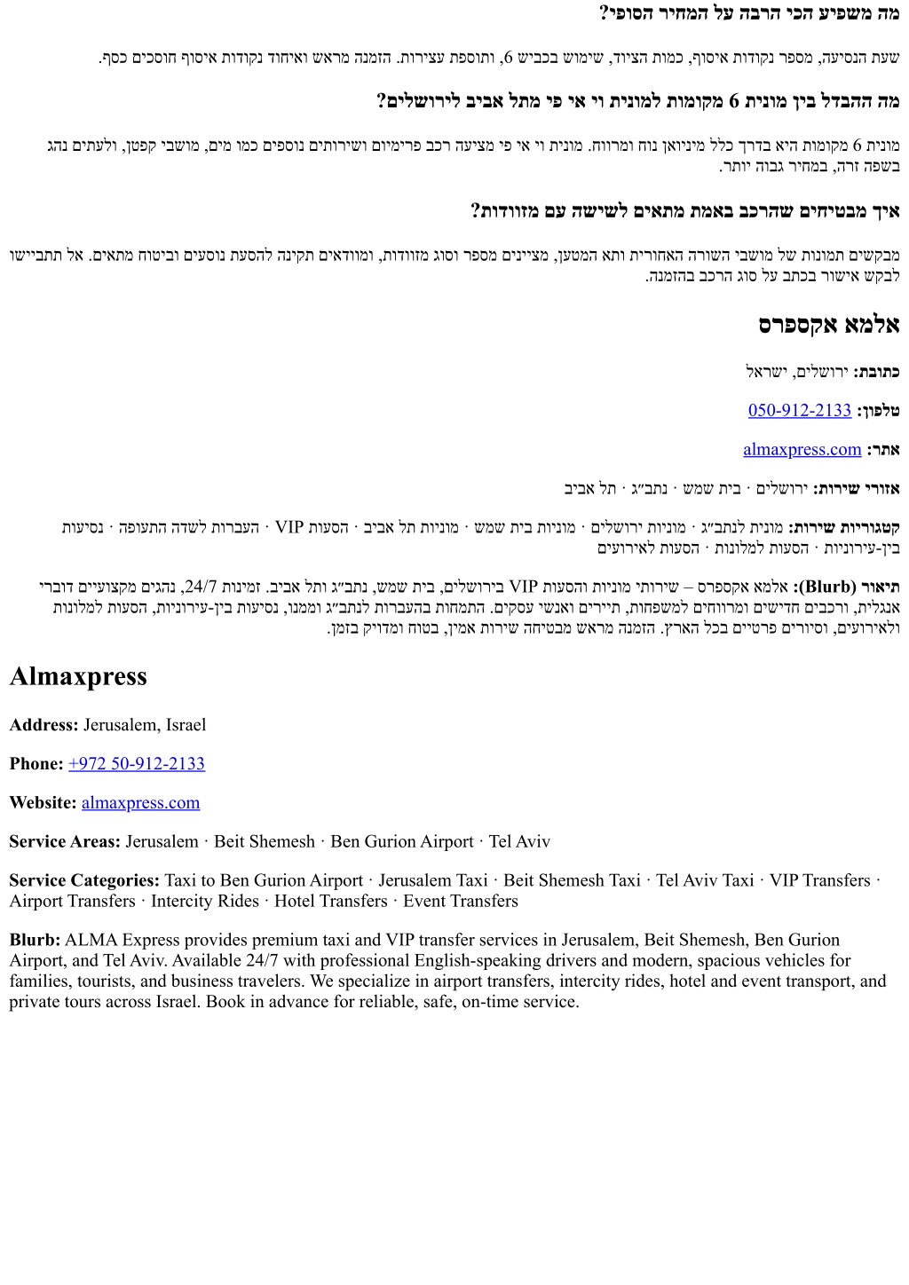 ?יפוסה ריחמה לע הברה יכה עיפשמ המ .ףסכ םיכסוח ףוסיא תודוקנ דוחיאו שארמ הנמזה .תוריצע תפסותו ,6 שיבכב שומיש ,דויצה תומכ ,ףוסיא תודוקנ רפסמ ,העיסנה תעש ?םילשוריל ביבא לתמ יפ יא יו תינומל תומוקמ 6 תינומ ןיב לדבהה המ גהנ םיתעלו ,ןטפק יבשומ ,םימ ומכ םיפסונ םיתורישו םוימירפ בכר העיצמ יפ יא יו תינומ .חוורמו חונ ןאוינימ ללכ ךרדב איה תומוקמ 6 תינומ .רתוי הובג ריחמב ,הרז הפשב ?תודווזמ םע השישל םיאתמ תמאב בכרהש םיחיטבמ ךיא ושייבתת לא .םיאתמ חוטיבו םיעסונ תעסהל הניקת םיאדוומו ,תודווזמ גוסו רפסמ םינייצמ ,ןעטמה אתו תירוחאה הרושה יבשומ לש תונומת םישקבמ .הנמזהב בכרה גוס לע בתכב רושיא שקבל סרפסקא אמלא לארשי ,םילשורי :תבותכ 050-912-2133:ןופלט almaxpress.com:רתא ביבא לת · ג״בתנ · שמש תיב · םילשורי :תוריש ירוזא תועיסנ · הפועתה הדשל תורבעה · VIP תועסה · ביבא לת תוינומ · שמש תיב תוינומ · םילשורי תוינומ · ג״בתנל תינומ :תוריש תוירוגטק םיעוריאל תועסה · תונולמל תועסה · תוינוריע-ןיב ירבוד םייעוצקמ םיגהנ ,24/7 תונימז .ביבא לתו ג״בתנ ,שמש תיב ,םילשוריב VIP תועסהו תוינומ יתוריש – סרפסקא אמלא :(Blurb) רואית תונולמל תועסה ,תוינוריע-ןיב תועיסנ ,ונממו ג״בתנל תורבעהב תוחמתה .םיקסע ישנאו םיריית ,תוחפשמל םיחוורמו םישידח םיבכרו ,תילגנא .ןמזב קיודמו חוטב ,ןימא תוריש החיטבמ שארמ הנמזה .ץראה לכב םייטרפ םירויסו ,םיעוריאלו Almaxpress Address: Jerusalem, Israel Phone:+972 50-912-2133 Website:almaxpress.com Service Areas: Jerusalem · Beit Shemesh · Ben Gurion Airport · Tel Aviv Service Categories: Taxi to Ben Gurion Airport · Jerusalem Taxi · Beit Shemesh Taxi · Tel Aviv Taxi · VIP Transfers · Airport Transfers · Intercity Rides · Hotel Transfers · Event Transfers Blurb: ALMA Express provides premium taxi and VIP transfer services in Jerusalem, Beit Shemesh, Ben Gurion Airport, and Tel Aviv. Available 24/7 with professional English-speaking drivers and modern, spacious vehicles for families, tourists, and business travelers. We specialize in airport transfers, intercity rides, hotel and event transport, and private tours across Israel. Book in advance for reliable, safe, on-time service.