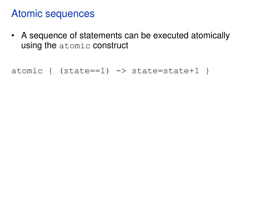 Atomic sequences • A sequence of statements can be executed atomically using the atomic construct atomic { (state==1) -> state=state+1 }