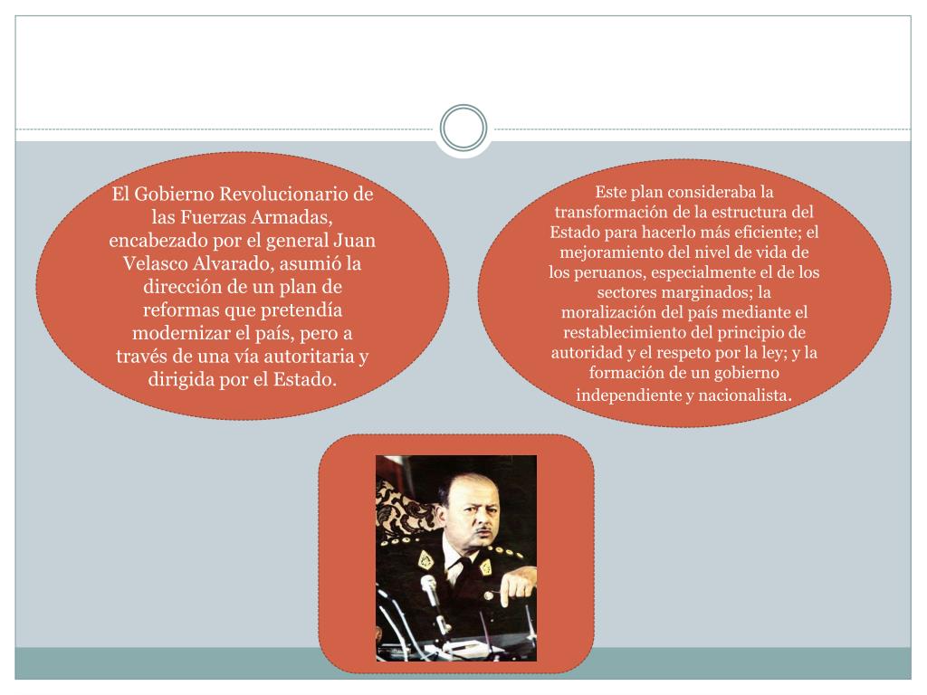 El Gobierno Revolucionario de las Fuerzas Armadas, encabezado por el general Juan Velasco Alvarado, asumió la dirección de un plan de reformas que pretendía modernizar el país, pero a través de una vía autoritaria y dirigida por el Estado. Este plan consideraba la transformación de la estructura del Estado para hacerlo más eficiente; el mejoramiento del nivel de vida de los peruanos, especialmente el de los sectores marginados; la moralización del país mediante el restablecimiento del principio de autoridad y el respeto por la ley; y la formación de un gobierno independiente y nacionalista.