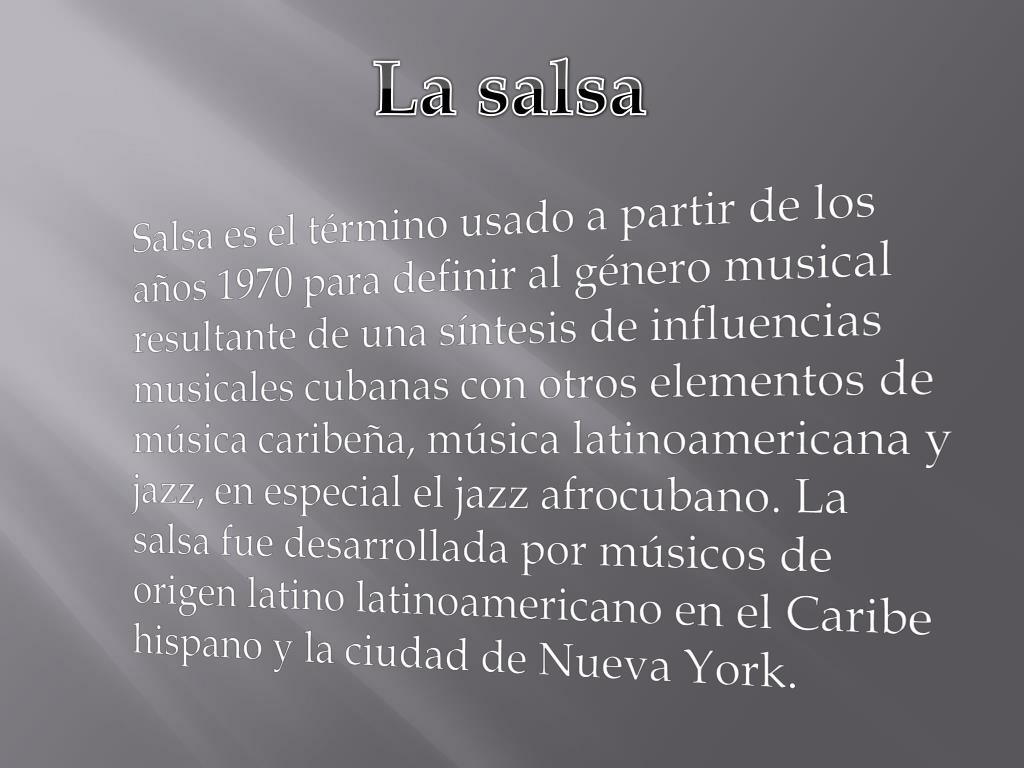 La salsa Salsa es el término usado a partir de los años 1970 para definir al género musical resultante de una síntesis de influencias musicales cubanas con otros elementos de música caribeña, música latinoamericana y jazz, en especial el jazz afrocubano. La salsa fue desarrollada por músicos de origen latino latinoamericano en el Caribe hispano y la ciudad de Nueva York.