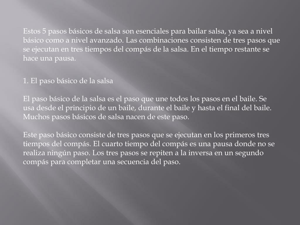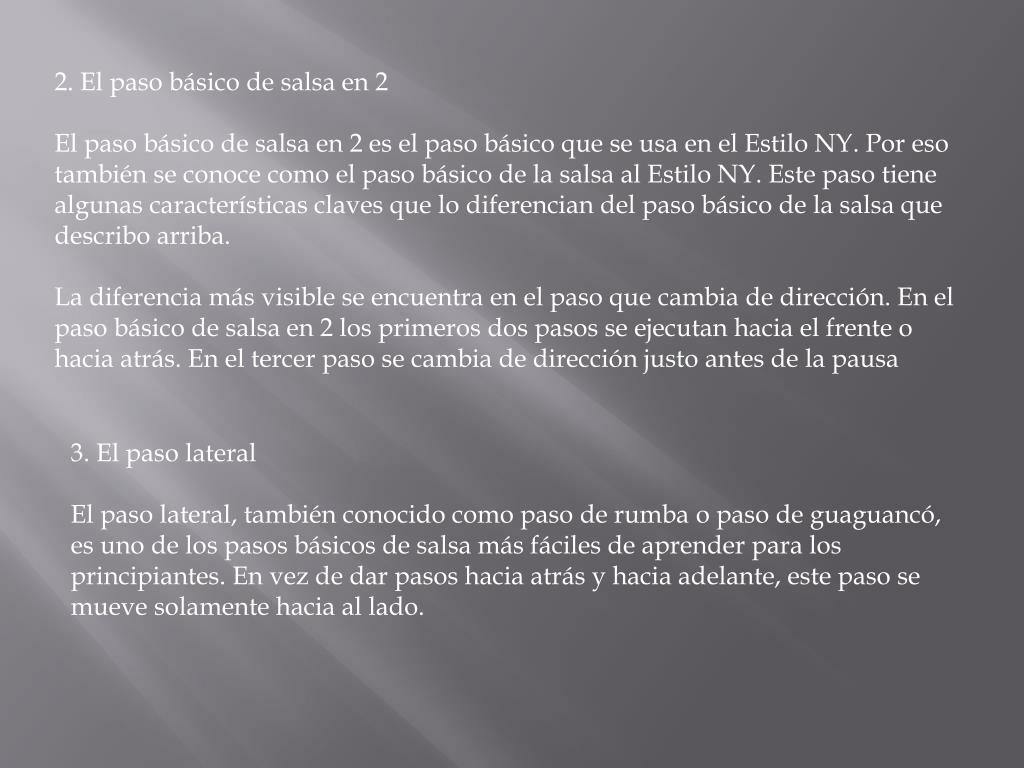 2. El paso básico de salsa en 2 El paso básico de salsa en 2 es el paso básico que se usa en el Estilo NY. Por eso también se conoce como el paso básico de la salsa al Estilo NY. Este paso tiene algunas características claves que lo diferencian del paso básico de la salsa que describo arriba. La diferencia más visible se encuentra en el paso que cambia de dirección. En el paso básico de salsa en 2 los primeros dos pasos se ejecutan hacia el frente o hacia atrás. En el tercer paso se cambia de dirección justo antes de la pausa 3. El paso lateral El paso lateral, también conocido como paso de rumba o paso de guaguancó, es uno de los pasos básicos de salsa más fáciles de aprender para los principiantes. En vez de dar pasos hacia atrás y hacia adelante, este paso se mueve solamente hacia al lado.