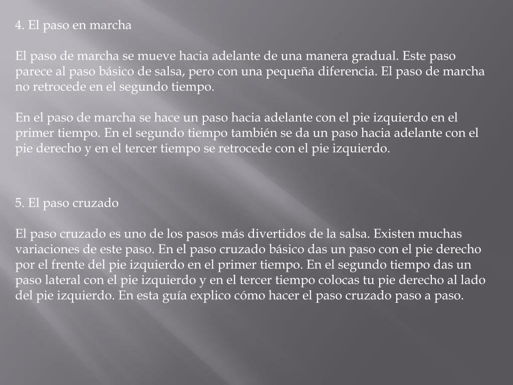 4. El paso en marcha El paso de marcha se mueve hacia adelante de una manera gradual. Este paso parece al paso básico de salsa, pero con una pequeña diferencia. El paso de marcha no retrocede en el segundo tiempo. En el paso de marcha se hace un paso hacia adelante con el pie izquierdo en el primer tiempo. En el segundo tiempo también se da un paso hacia adelante con el pie derecho y en el tercer tiempo se retrocede con el pie izquierdo. 5. El paso cruzado El paso cruzado es uno de los pasos más divertidos de la salsa. Existen muchas variaciones de este paso. En el paso cruzado básico das un paso con el pie derecho por el frente del pie izquierdo en el primer tiempo. En el segundo tiempo das un paso lateral con el pie izquierdo y en el tercer tiempo colocas tu pie derecho al lado del pie izquierdo. En esta guía explico cómo hacer el paso cruzado paso a paso.