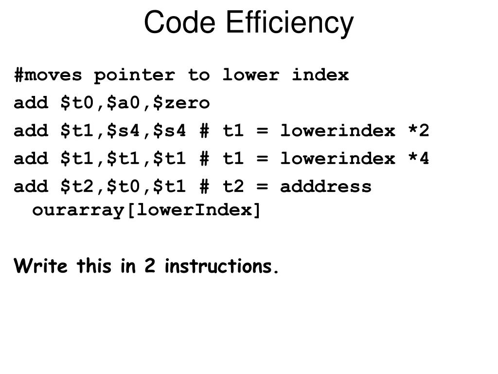 Code Efficiency • #moves pointer to lower index • add $t0,$a0,$zero • add $t1,$s4,$s4 # t1 = lowerindex *2 • add $t1,$t1,$t1 # t1 = lowerindex *4 • add $t2,$t0,$t1 # t2 = adddress ourarray[lowerIndex] • Write this in 2 instructions.