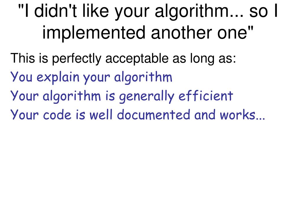"I didn't like your algorithm... so I implemented another one" • This is perfectly acceptable as long as: • You explain your algorithm • Your algorithm is generally efficient • Your code is well documented and works...