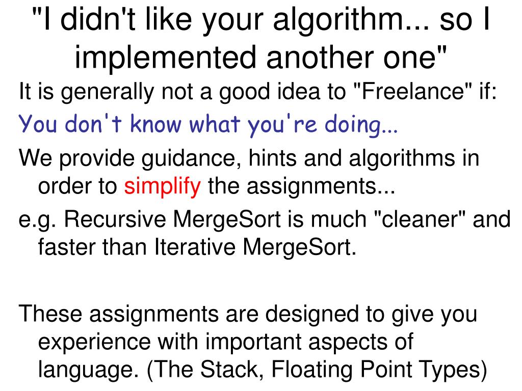 "I didn't like your algorithm... so I implemented another one" • It is generally not a good idea to "Freelance" if: • You don't know what you're doing... • We provide guidance, hints and algorithms in order to simplify the assignments... • e.g. Recursive MergeSort is much "cleaner" and faster than Iterative MergeSort. • These assignments are designed to give you experience with important aspects of language. (The Stack, Floating Point Types)