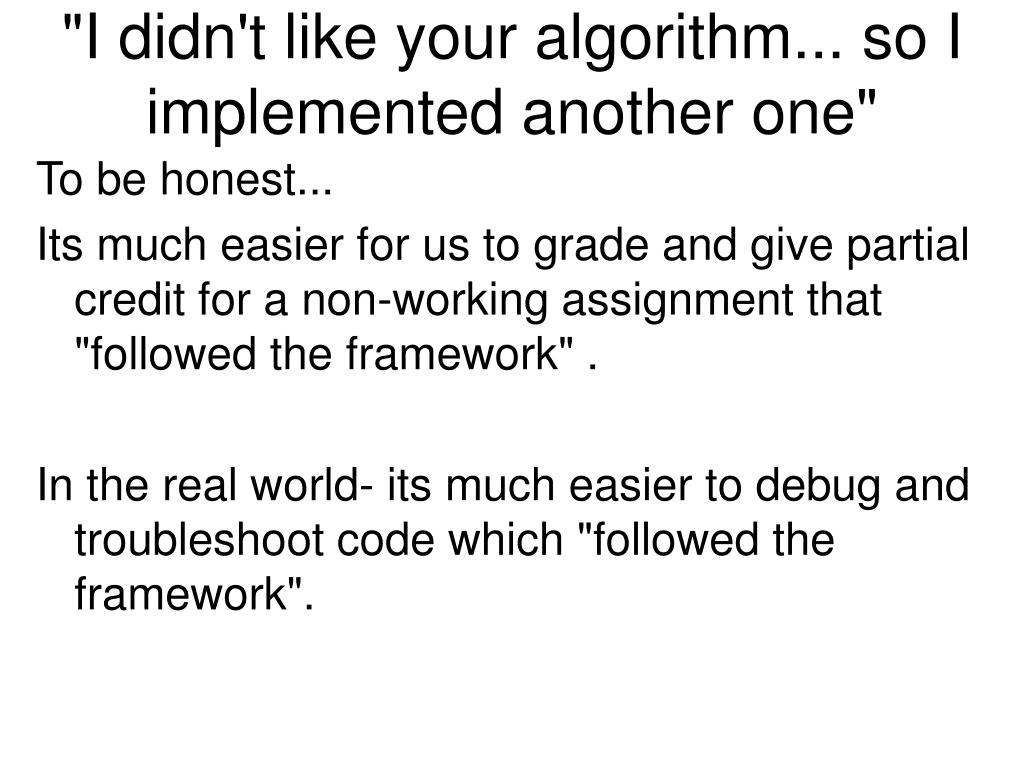 "I didn't like your algorithm... so I implemented another one" • To be honest... • Its much easier for us to grade and give partial credit for a non-working assignment that "followed the framework" . • In the real world- its much easier to debug and troubleshoot code which "followed the framework".