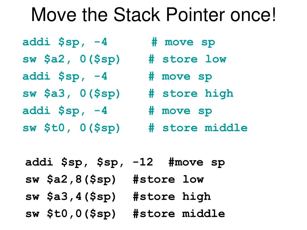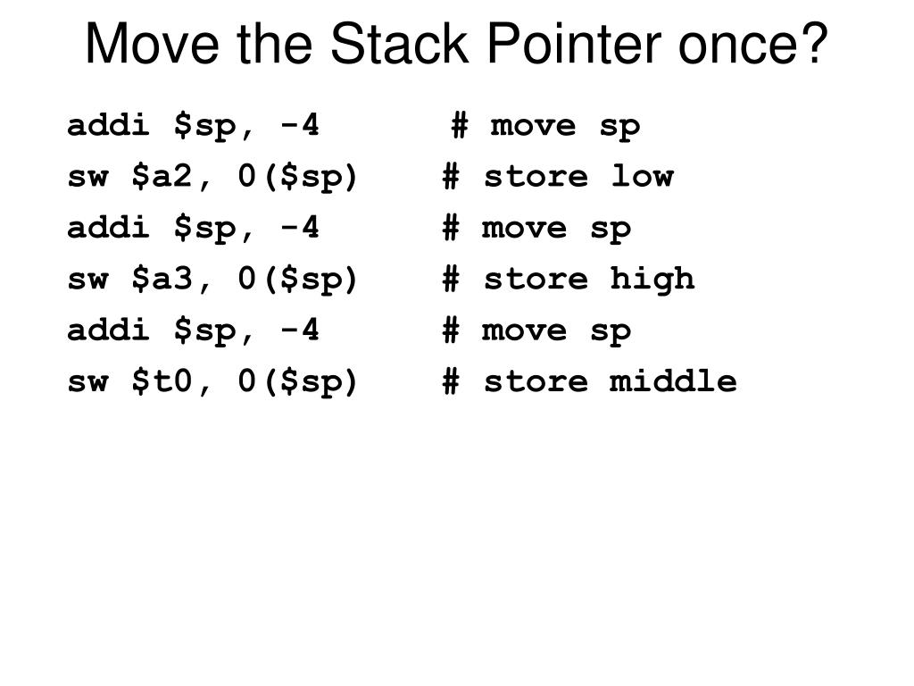 Move the Stack Pointer once? • addi $sp, -4 # move sp • sw $a2, 0($sp) # store low • addi $sp, -4 # move sp • sw $a3, 0($sp) # store high • addi $sp, -4 # move sp • sw $t0, 0($sp) # store middle