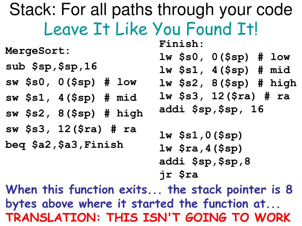 Stack: For all paths through your codeLeave It Like You Found It! Finish: lw $s0, 0($sp) # low lw $s1, 4($sp) # mid lw $s2, 8($sp) # high lw $s3, 12($ra) # ra addi $sp,$sp, 16 lw $s1,0($sp) lw $ra,4($sp) addi $sp,$sp,8 jr $ra • MergeSort: • sub $sp,$sp,16 • sw $s0, 0($sp) # low • sw $s1, 4($sp) # mid • sw $s2, 8($sp) # high • sw $s3, 12($ra) # ra • beq $a2,$a3,Finish When this function exits... the stack pointer is 8 bytes above where it started the function at... TRANSLATION: THIS ISN'T GOING TO WORK