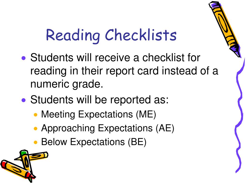 Reading Checklists • Students will receive a checklist for reading in their report card instead of a numeric grade. • Students will be reported as: • Meeting Expectations (ME) • Approaching Expectations (AE) • Below Expectations (BE)